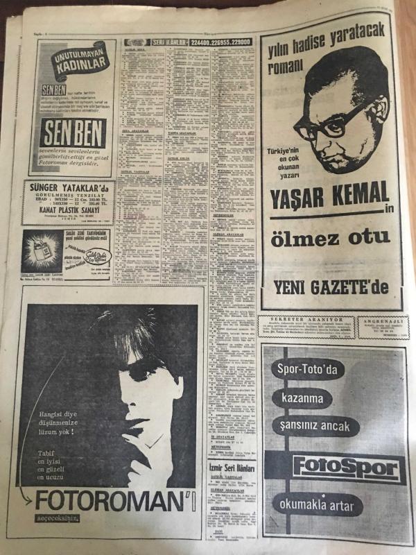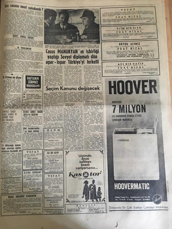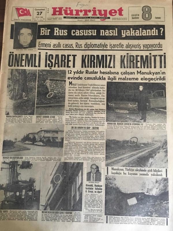HÜRRİYET GAZETESİ 27 OCAK 1968 YIL :20 SAYI :7094---Önemli işaret kırmızı kiremitti --Kuzey Kutbunda Beyaz Ayılara Etiket Konacak --Kobra yılanları ile dolu çukurda gösteri ---Galatasaray A.Ordu Önünde ---Mister Yusuf Türklere Bir Kupa Kazandırdı ---Üçüncü sınıf rollerle çıkan Sevda Nur , kocamın önünden faydalanarak reklam yapmak istiyor ---G.Tepe Voyvodina maçı hazırlıklarına başladı ---Güreş Federasyonu Başkanlığına yine Uskan Getirildi ---Avusturyalı antrenör Tandler Galatasaray diye diye öldü ---Casus Manukyan ın işbirliği yaptığı Sovyet diplomatı dün apar -topar Türkiye yi terk etti ---Seçim Kanunu Değişecek ----Kayseri inşa edilecek yeni şadırvanlarla süslenecek ---Manukyan Türkiye aleyhinde gizli bilgileri koyduğu bu kayanın yanında yakalandı --, SEDAT SİMAVİ tarafından kaleme alınmıştır. Kitap 1968 yılında [HÜRRİYET MATBAA] yayınlanmıştır. 8 sayfadır. HÜRRİYET GAZETESİ 27 OCAK 1968 YIL :20 SAYI :7094---Önemli işaret kırmızı kiremitti --Kuzey Kutbunda Beyaz Ayılara Etiket Konacak --Kobra yılanları ile dolu çukurda gösteri ---Galatasaray A.Ordu Önünde ---Mister Yusuf Türklere Bir Kupa Kazandırdı ---Üçüncü sınıf rollerle çıkan Sevda Nur , kocamın önünden faydalanarak reklam yapmak istiyor ---G.Tepe Voyvodina maçı hazırlıklarına başladı ---Güreş Federasyonu Başkanlığına yine Uskan Getirildi ---Avusturyalı antrenör Tandler Galatasaray diye diye öldü ---Casus Manukyan ın işbirliği yaptığı Sovyet diplomatı dün apar -topar Türkiye yi terk etti ---Seçim Kanunu Değişecek ----Kayseri inşa edilecek yeni şadırvanlarla süslenecek ---Manukyan Türkiye aleyhinde gizli bilgileri koyduğu bu kayanın yanında yakalandı -- adlı eser Türkçe dilindedir.