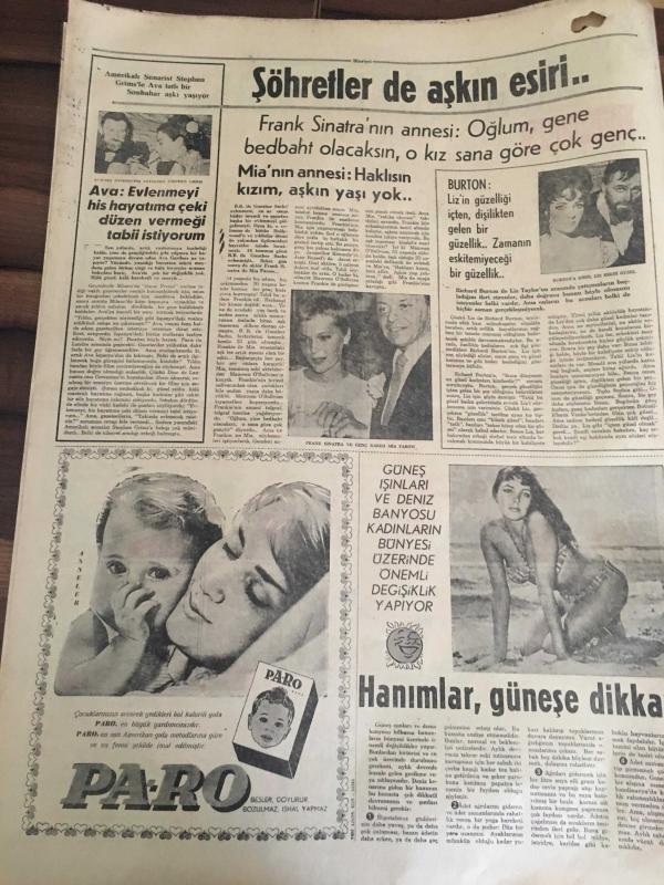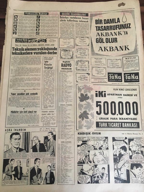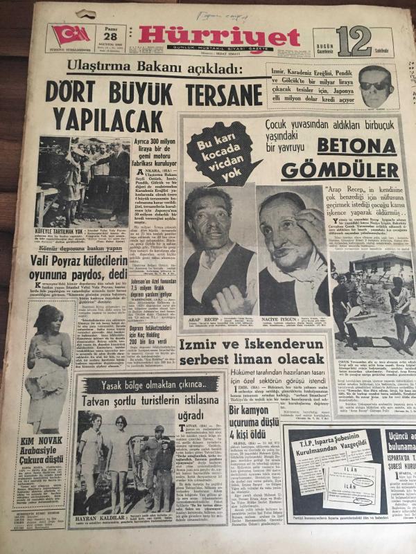 HÜRRİYET GAZETESİ 28 AĞUSTOS 1966 YIL :19 SAYI :6584---Ulaştırma Bakanı Açıkladı : Dört Büyük Tersanen Yapılacak----Şöhretlerde aşkın esiri Frank Sinatra ve genç karısı Mia Farow--Amerikalı Senarist Stephen Grims le Ava tatlı bir sonbahar aşkı yaşıyor --Nazar Film :1966-1967 :Rona Film ,1) Yedi Altın Adam ,2) Onuncu Kurban ,3) Ölüm Saçan Adam ,4) Tuz Ekmek ,5) Kanlı Cellat ,6) Hitlerin Gizli Teşkilatı ,7) Kaplanlar Kralı ,8) Bükülmeyen Kılıç ,9) Herkül ve Deniz Canavarı ,10) Serseri Kurşun, 11) Romel 'in Hazinesi , 12) Kanlı Miras , 13 )Silahlar Konuşsun , 14) Haydutlar Kralı ,15) Ateş Saçan Canavar ,16) Yedi Muhteşem Asi , 17)Bin Dolar İçin , 18 ) Herkül 'ün Oğlu Babil de ,19) 002 İtalya dan Sevgilerle ,20) Kardeş İntikamı ---Fenerbahçe -Galatasaray maçı radyo vermeyecek ---Kamil Ocak : Meleksoy 'un mukavelesi incelenecek ---Altay dün İzmir Spor la golsüz berabere kaldı --- Yıpranma, sararmalar, kupon kesiği ve yırtılmalar zamana bağlı olarak görülebilir.