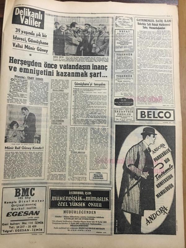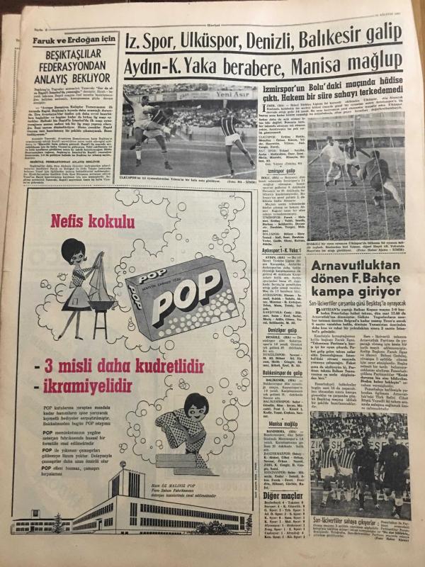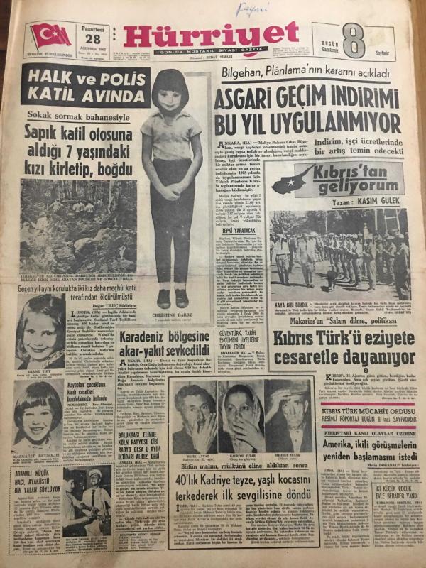 HÜRRİYET GAZETESİ 28 AĞUSTOS 1967 YIL :20 SAYI :6944--Sapık katil otosuna aldığı 7 yaşındaki kızı kirletip , boğdu --Asgari geçim indirimi bu yıl uygulanmıyor ---Karadeniz bölgesine akar-yakıt sevk edildi ---Kaybolan çocukların kanlı cesetleri buzdolabında bulundu ---Kıbrıs Türk 'ü eziyete cesaretle dayanıyor --40 lık Kadriye teyze yaşlı kocasını terk ederek ilk sevgilisine döndü ---Amerika ,ikili görüşmelerin yeniden başlamasını istedi --Yugoslavya yı istila eden dev farelerden kediler bile korktu ---Beşiktaşlılar Federasyondan Anlayış Bekliyor --İz.Spor ,Ülküspor ,Denizli ,Balıkesir galip Aydın -K.Yaka berabere Manisa Mağlup ---Arnavutluk tan dönen Fenerbahçe kampa giriyor ---En hadiseli plaklarını iftiharla takdim eder : Nuri Sesigüzel ---Kıbrıs Türk Mücahit Ordusu ---4 yılda çığ gibi büyüdüler --- Yıpranma, sararmalar, kupon kesiği ve yırtılmalar zamana bağlı olarak görülebilir.