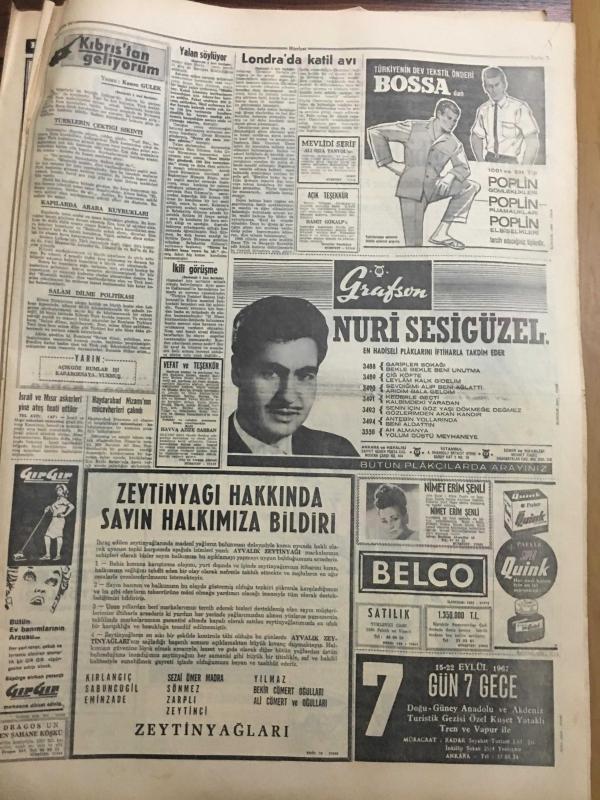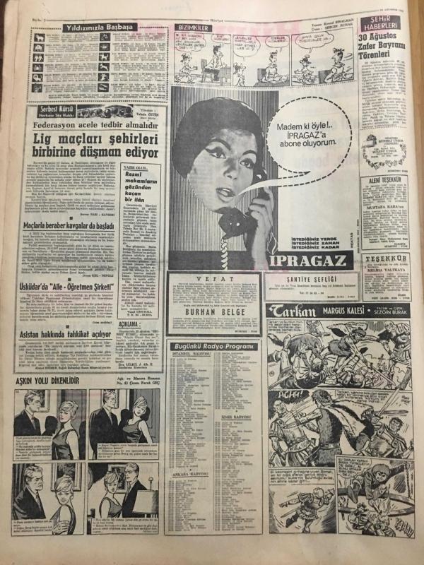 HÜRRİYET GAZETESİ 28 AĞUSTOS 1967 YIL :20 SAYI :6944--Sapık katil otosuna aldığı 7 yaşındaki kızı kirletip , boğdu --Asgari geçim indirimi bu yıl uygulanmıyor ---Karadeniz bölgesine akar-yakıt sevk edildi ---Kaybolan çocukların kanlı cesetleri buzdolabında bulundu ---Kıbrıs Türk 'ü eziyete cesaretle dayanıyor --40 lık Kadriye teyze yaşlı kocasını terk ederek ilk sevgilisine döndü ---Amerika ,ikili görüşmelerin yeniden başlamasını istedi --Yugoslavya yı istila eden dev farelerden kediler bile korktu ---Beşiktaşlılar Federasyondan Anlayış Bekliyor --İz.Spor ,Ülküspor ,Denizli ,Balıkesir galip Aydın -K.Yaka berabere Manisa Mağlup ---Arnavutluk tan dönen Fenerbahçe kampa giriyor ---En hadiseli plaklarını iftiharla takdim eder : Nuri Sesigüzel ---Kıbrıs Türk Mücahit Ordusu ---4 yılda çığ gibi büyüdüler ---, SEDAT SİMAVİ tarafından kaleme alınmıştır. Kitap 1967 yılında [HÜRRİYET MATBAA] yayınlanmıştır. 8 sayfadır. HÜRRİYET GAZETESİ 28 AĞUSTOS 1967 YIL :20 SAYI :6944--Sapık katil otosuna aldığı 7 yaşındaki kızı kirletip , boğdu --Asgari geçim indirimi bu yıl uygulanmıyor ---Karadeniz bölgesine akar-yakıt sevk edildi ---Kaybolan çocukların kanlı cesetleri buzdolabında bulundu ---Kıbrıs Türk 'ü eziyete cesaretle dayanıyor --40 lık Kadriye teyze yaşlı kocasını terk ederek ilk sevgilisine döndü ---Amerika ,ikili görüşmelerin yeniden başlamasını istedi --Yugoslavya yı istila eden dev farelerden kediler bile korktu ---Beşiktaşlılar Federasyondan Anlayış Bekliyor --İz.Spor ,Ülküspor ,Denizli ,Balıkesir galip Aydın -K.Yaka berabere Manisa Mağlup ---Arnavutluk tan dönen Fenerbahçe kampa giriyor ---En hadiseli plaklarını iftiharla takdim eder : Nuri Sesigüzel ---Kıbrıs Türk Mücahit Ordusu ---4 yılda çığ gibi büyüdüler --- adlı eser Türkçe dilindedir.