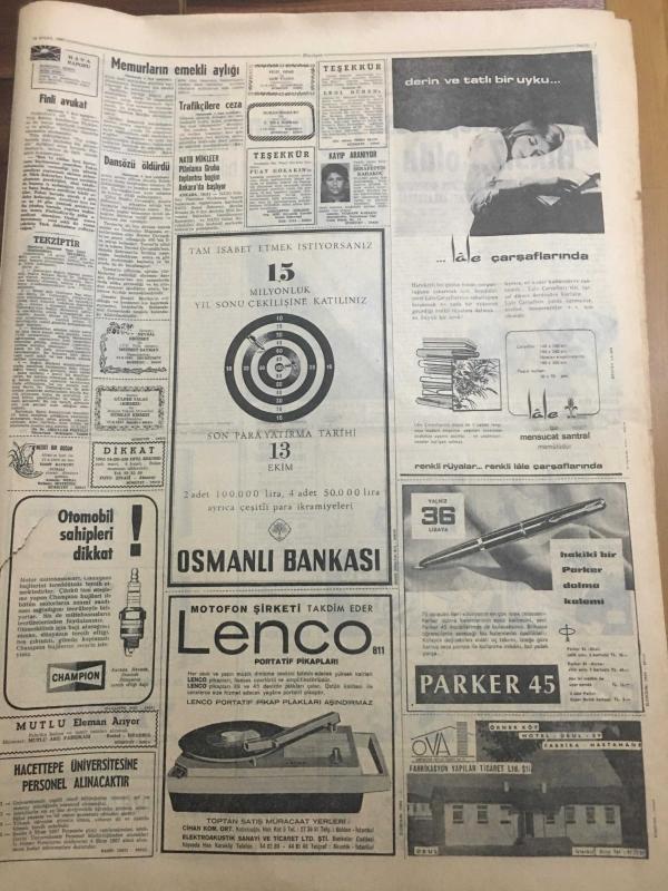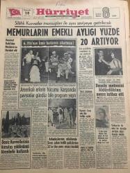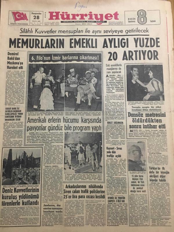 HÜRRİYET GAZETESİ 28 EYLÜL 1967 YIL :20 SAYI :6975--Memurların emekli aylığı yüzde 20 artıyor --Demirel Bakü dan Moskova ya hareket etti --Amerikalı erlerin hücumu karşısında pavyonlar gündüz bile program yaptı ---Deniz kuvvetlerinin kuruluş yıldönümü törenlerle kutlandı --Arkadaşlarının nikahında Siren çalan trafik polislerine 25 er lira para cezası kesildi --Dansöz metresini öldürdükten sonra intihar etti --Türkiye de ilk defa bir köpeğin akciğeri diğer köpeğe takıldı ---Güney Kutup Seferine Peter Scott Başkanlık Ediyor ---Sanat Güneşimiz :Zeki Müren --Ümit takımı Romanya yı 2-1 yendi --Beşiktaş ın işi kolaylaşıyor --Mersin İ.Yurdun da huzur kalmadı --Adnan Süvari rövanş maçından çekiniyor --Üçüncü Türkiye Ligi Pazar Günü Başlıyor ---Bir köpek aşk yüzünden hırsız oldu --Amerikalılar vergisi çok diye Milli piyango bileti almıyor ---Jandarma dur emrine uymayan kaçakçıyı vurdu ---Otobüs ile traktör çarpıştı 3 ölü var --Kayseri -Sivas yolu dün trafiğe açıldı --- Yıpranma, sararmalar, kupon kesiği ve yırtılmalar zamana bağlı olarak görülebilir.