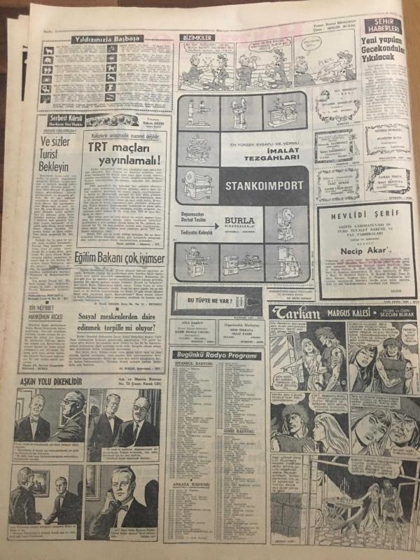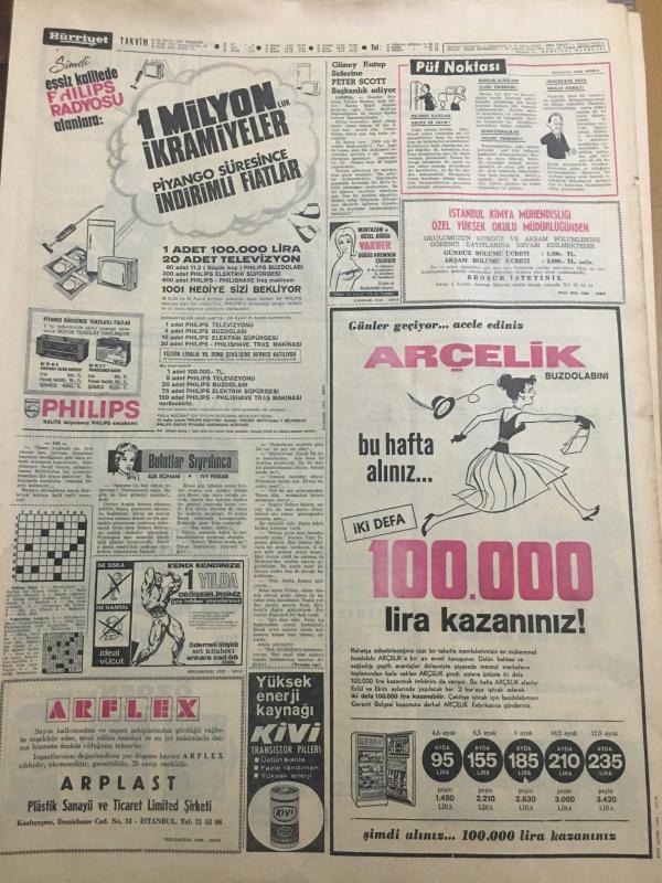 HÜRRİYET GAZETESİ 28 EYLÜL 1967 YIL :20 SAYI :6975--Memurların emekli aylığı yüzde 20 artıyor --Demirel Bakü dan Moskova ya hareket etti --Amerikalı erlerin hücumu karşısında pavyonlar gündüz bile program yaptı ---Deniz kuvvetlerinin kuruluş yıldönümü törenlerle kutlandı --Arkadaşlarının nikahında Siren çalan trafik polislerine 25 er lira para cezası kesildi --Dansöz metresini öldürdükten sonra intihar etti --Türkiye de ilk defa bir köpeğin akciğeri diğer köpeğe takıldı ---Güney Kutup Seferine Peter Scott Başkanlık Ediyor ---Sanat Güneşimiz :Zeki Müren --Ümit takımı Romanya yı 2-1 yendi --Beşiktaş ın işi kolaylaşıyor --Mersin İ.Yurdun da huzur kalmadı --Adnan Süvari rövanş maçından çekiniyor --Üçüncü Türkiye Ligi Pazar Günü Başlıyor ---Bir köpek aşk yüzünden hırsız oldu --Amerikalılar vergisi çok diye Milli piyango bileti almıyor ---Jandarma dur emrine uymayan kaçakçıyı vurdu ---Otobüs ile traktör çarpıştı 3 ölü var --Kayseri -Sivas yolu dün trafiğe açıldı ---, SEDAT SİMAVİ tarafından kaleme alınmıştır. Kitap 1967 yılında [HÜRRİYET MATBAA] yayınlanmıştır. 8 sayfadır. HÜRRİYET GAZETESİ 28 EYLÜL 1967 YIL :20 SAYI :6975--Memurların emekli aylığı yüzde 20 artıyor --Demirel Bakü dan Moskova ya hareket etti --Amerikalı erlerin hücumu karşısında pavyonlar gündüz bile program yaptı ---Deniz kuvvetlerinin kuruluş yıldönümü törenlerle kutlandı --Arkadaşlarının nikahında Siren çalan trafik polislerine 25 er lira para cezası kesildi --Dansöz metresini öldürdükten sonra intihar etti --Türkiye de ilk defa bir köpeğin akciğeri diğer köpeğe takıldı ---Güney Kutup Seferine Peter Scott Başkanlık Ediyor ---Sanat Güneşimiz :Zeki Müren --Ümit takımı Romanya yı 2-1 yendi --Beşiktaş ın işi kolaylaşıyor --Mersin İ.Yurdun da huzur kalmadı --Adnan Süvari rövanş maçından çekiniyor --Üçüncü Türkiye Ligi Pazar Günü Başlıyor ---Bir köpek aşk yüzünden hırsız oldu --Amerikalılar vergisi çok diye Milli piyango bileti almıyor ---Jandarma dur emrine uymayan kaçakçıyı vurdu ---Otobüs ile traktör çarpıştı 3 ölü var --Kayseri -Sivas yolu dün trafiğe açıldı --- adlı eser Türkçe dilindedir.