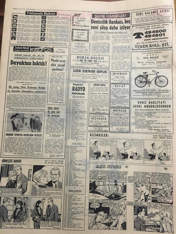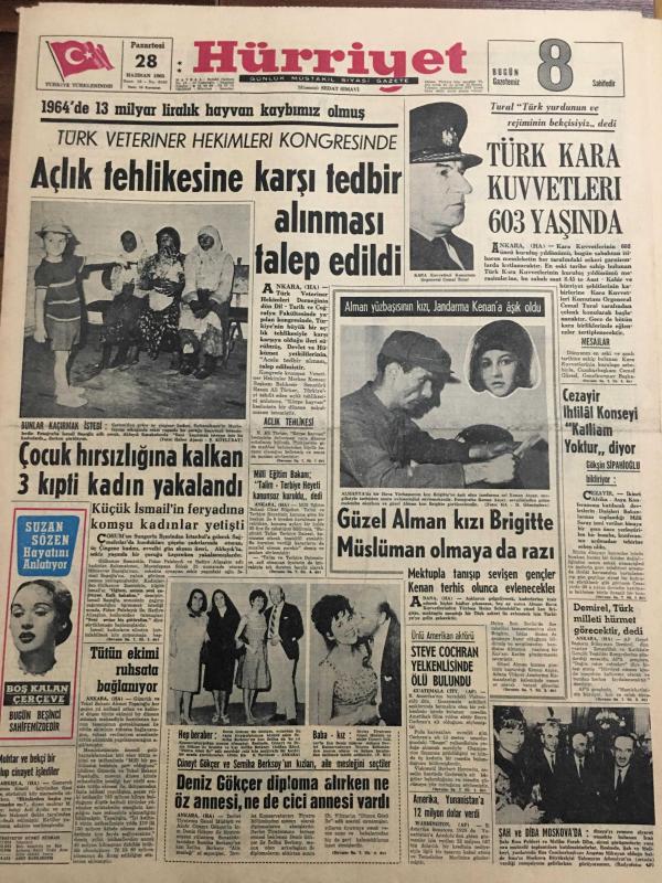HÜRRİYET GAZETESİ 28 HAZİRAN 1965 YIL :18 SAYI :6163--Açlık tehlikesine karşı tedbir alınması talep edildi --Çocuk hırsızlığına kalkan 3 kıpti kadın yakalandı --Türk Kara Kuvvetleri 603 Yaşında ---Cezayir İhtilal Konseyi Katliam Yoktur Diyor ---Güzel Alman kızı Brigitte Müslüman olmaya da razı ---Tütün ekimi ruhsata bağlanıyor ---Steve Cochran yelkenlisinde ölü bulundu --Deniz Gökçer diploma alırken ne öz annesi ,ne de cici annesi vardı ---Denizcilik Bankası ,beş yeni şilep daha istiyor ---Türk -Yunan müzakereleri Ankara da resmen başlıyor --Fenerbahçe -Galatasaray 0-0 berabere kaldılar --Fenerbahçe ve Galatasaray satış listesini bugün açıklıyor ---İtalya da transfer sönük geçecek --Taksim : 1 Toprakspor :1---Yaşar Doğu ile Türk Güreşi Öldü ---Bir köyün kuruluş yıldönümü kutlandı --Fotoğraf Yarışma ---Amerika Yunanistan a 12 milyon dolar verdi -- Yıpranma, sararmalar, kupon kesiği ve yırtılmalar zamana bağlı olarak görülebilir.
