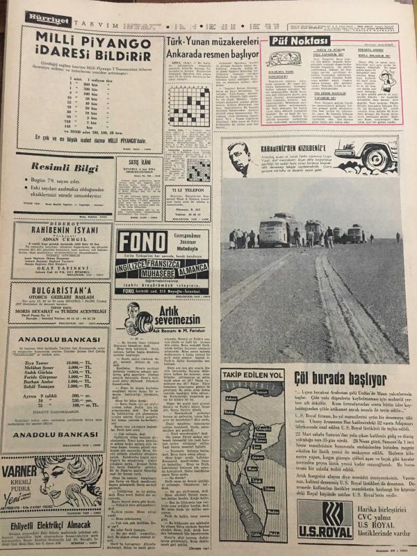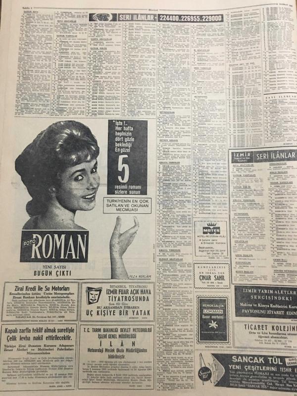 HÜRRİYET GAZETESİ 28 HAZİRAN 1965 YIL :18 SAYI :6163--Açlık tehlikesine karşı tedbir alınması talep edildi --Çocuk hırsızlığına kalkan 3 kıpti kadın yakalandı --Türk Kara Kuvvetleri 603 Yaşında ---Cezayir İhtilal Konseyi Katliam Yoktur Diyor ---Güzel Alman kızı Brigitte Müslüman olmaya da razı ---Tütün ekimi ruhsata bağlanıyor ---Steve Cochran yelkenlisinde ölü bulundu --Deniz Gökçer diploma alırken ne öz annesi ,ne de cici annesi vardı ---Denizcilik Bankası ,beş yeni şilep daha istiyor ---Türk -Yunan müzakereleri Ankara da resmen başlıyor --Fenerbahçe -Galatasaray 0-0 berabere kaldılar --Fenerbahçe ve Galatasaray satış listesini bugün açıklıyor ---İtalya da transfer sönük geçecek --Taksim : 1 Toprakspor :1---Yaşar Doğu ile Türk Güreşi Öldü ---Bir köyün kuruluş yıldönümü kutlandı --Fotoğraf Yarışma ---Amerika Yunanistan a 12 milyon dolar verdi --, SEDAT SİMAVİ tarafından kaleme alınmıştır. Kitap 1965 yılında [HÜRRİYET MATBAA] yayınlanmıştır. 8 sayfadır. HÜRRİYET GAZETESİ 28 HAZİRAN 1965 YIL :18 SAYI :6163--Açlık tehlikesine karşı tedbir alınması talep edildi --Çocuk hırsızlığına kalkan 3 kıpti kadın yakalandı --Türk Kara Kuvvetleri 603 Yaşında ---Cezayir İhtilal Konseyi Katliam Yoktur Diyor ---Güzel Alman kızı Brigitte Müslüman olmaya da razı ---Tütün ekimi ruhsata bağlanıyor ---Steve Cochran yelkenlisinde ölü bulundu --Deniz Gökçer diploma alırken ne öz annesi ,ne de cici annesi vardı ---Denizcilik Bankası ,beş yeni şilep daha istiyor ---Türk -Yunan müzakereleri Ankara da resmen başlıyor --Fenerbahçe -Galatasaray 0-0 berabere kaldılar --Fenerbahçe ve Galatasaray satış listesini bugün açıklıyor ---İtalya da transfer sönük geçecek --Taksim : 1 Toprakspor :1---Yaşar Doğu ile Türk Güreşi Öldü ---Bir köyün kuruluş yıldönümü kutlandı --Fotoğraf Yarışma ---Amerika Yunanistan a 12 milyon dolar verdi -- adlı eser Türkçe dilindedir.