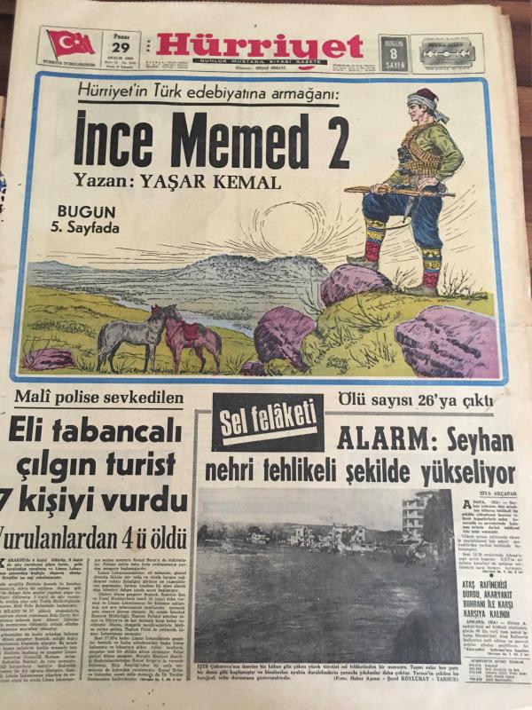 HÜRRİYET GAZETESİ 29 ARALIK 1968 YIL :21 SAYI 7426----Hürriyet 'in Türk edebiyatına armağanı : İnce Memed :Yaşar Kemal ---Eli tabancalı çılgın turist 7 kişiyi vurdu ----Sel Felaketi :Ölü sayısı 26 'ya çıktı ----Alarm :Seyhan nehri tehlikeli şekilde yükseliyor -----Nazmiye Hanımın çilesi :Başbakan hanımı olmak -----Boşanma sebepleri üzerinde yapılan yeni araştırmalar ---Nijerya'nın petrol kavgası yüzünden patlak veren bir ayaklanma----TİP kongresinin ilk raundunda aybarcılar galip ----Halk ozanı talibi Güllüşah 'a talip oldu ---Los Paraguayos Orkestrası İstanbullu kabadayıları dövünce silahlar konuştu ----Irak 'ta başkan Arif 'i deviren 5 kumandan emekli oldu ---, SEDAT SİMAVİ tarafından kaleme alınmıştır. Kitap 1968 yılında [HÜRRİYET MATBAA] yayınlanmıştır. 16 sayfadır. HÜRRİYET GAZETESİ 29 ARALIK 1968 YIL :21 SAYI 7426----Hürriyet 'in Türk edebiyatına armağanı : İnce Memed :Yaşar Kemal ---Eli tabancalı çılgın turist 7 kişiyi vurdu ----Sel Felaketi :Ölü sayısı 26 'ya çıktı ----Alarm :Seyhan nehri tehlikeli şekilde yükseliyor -----Nazmiye Hanımın çilesi :Başbakan hanımı olmak -----Boşanma sebepleri üzerinde yapılan yeni araştırmalar ---Nijerya'nın petrol kavgası yüzünden patlak veren bir ayaklanma----TİP kongresinin ilk raundunda aybarcılar galip ----Halk ozanı talibi Güllüşah 'a talip oldu ---Los Paraguayos Orkestrası İstanbullu kabadayıları dövünce silahlar konuştu ----Irak 'ta başkan Arif 'i deviren 5 kumandan emekli oldu --- adlı eser Türkçe dilindedir.