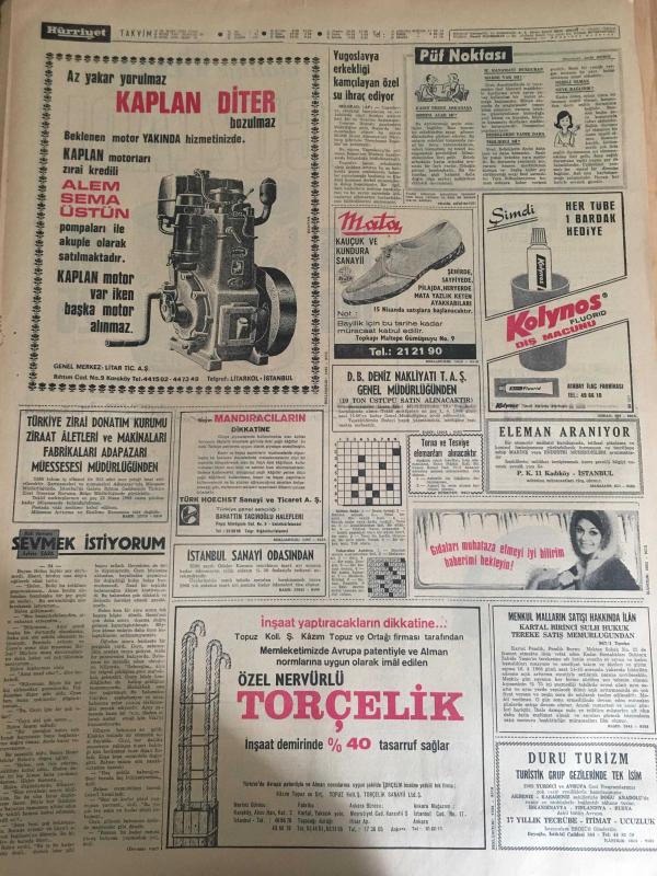 HÜRRİYET GAZETESİ 29 MART 1968 YIL :20 SAYI :7153-- Makarios ikili görüşmeler B.M ye bağlayıp oyun yapmak istiyor .---Baskı önlenmezse bağımsız Türk Devleti ilan edilecek ---Gümrük -Tekel Bakanı :Yurda kaçak otomobil sokuluyormuş ---6 Kişinin katili azılı Şaki Özbay dün yakalandı ---Agop Mursailoğlu Yurda Getirildi ---Fakat satmaya götürürken yakalanan silah imalcisi boşa emekler ve 15 bin lira dedi --- Uzaya çıkan ilk insan :Gagarin öldü ---Mahkemeden çıktıktan sonra minibüste kıstırdığı karısını öldürdü ; dostunu ağır yaraladı ---Yugoslavya erkekliği kamçılayan özel su ihraç ediyor ----Aday kadro yeniden açıklandı --Bursalı seyirciler Can ı istemiyor ---Irak Ordu Takımı 1-0 yendik ---İnönü nün torunu Eren kayak sporu yapıyor ---Büyük Katliam : Kürk manto için haftada 42 bin fok yavrusu vahşice öldürülüyor ---Yugoslav Başbakanı Bugün Ankara da -- Yıpranma, sararmalar, kupon kesiği ve yırtılmalar zamana bağlı olarak görülebilir.
