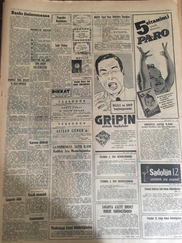 HÜRRİYET GAZETESİ 29 MART 1968 YIL :20 SAYI :7153-- Makarios ikili görüşmeler B.M ye bağlayıp oyun yapmak istiyor .---Baskı önlenmezse bağımsız Türk Devleti ilan edilecek ---Gümrük -Tekel Bakanı :Yurda kaçak otomobil sokuluyormuş ---6 Kişinin katili azılı Şaki Özbay dün yakalandı ---Agop Mursailoğlu Yurda Getirildi ---Fakat satmaya götürürken yakalanan silah imalcisi boşa emekler ve 15 bin lira dedi --- Uzaya çıkan ilk insan :Gagarin öldü ---Mahkemeden çıktıktan sonra minibüste kıstırdığı karısını öldürdü ; dostunu ağır yaraladı ---Yugoslavya erkekliği kamçılayan özel su ihraç ediyor ----Aday kadro yeniden açıklandı --Bursalı seyirciler Can ı istemiyor ---Irak Ordu Takımı 1-0 yendik ---İnönü nün torunu Eren kayak sporu yapıyor ---Büyük Katliam : Kürk manto için haftada 42 bin fok yavrusu vahşice öldürülüyor ---Yugoslav Başbakanı Bugün Ankara da --, SEDAT SİMAVİ tarafından kaleme alınmıştır. Kitap 1968 yılında [HÜRRİYET MATBAA] yayınlanmıştır. 8 sayfadır. HÜRRİYET GAZETESİ 29 MART 1968 YIL :20 SAYI :7153-- Makarios ikili görüşmeler B.M ye bağlayıp oyun yapmak istiyor .---Baskı önlenmezse bağımsız Türk Devleti ilan edilecek ---Gümrük -Tekel Bakanı :Yurda kaçak otomobil sokuluyormuş ---6 Kişinin katili azılı Şaki Özbay dün yakalandı ---Agop Mursailoğlu Yurda Getirildi ---Fakat satmaya götürürken yakalanan silah imalcisi boşa emekler ve 15 bin lira dedi --- Uzaya çıkan ilk insan :Gagarin öldü ---Mahkemeden çıktıktan sonra minibüste kıstırdığı karısını öldürdü ; dostunu ağır yaraladı ---Yugoslavya erkekliği kamçılayan özel su ihraç ediyor ----Aday kadro yeniden açıklandı --Bursalı seyirciler Can ı istemiyor ---Irak Ordu Takımı 1-0 yendik ---İnönü nün torunu Eren kayak sporu yapıyor ---Büyük Katliam : Kürk manto için haftada 42 bin fok yavrusu vahşice öldürülüyor ---Yugoslav Başbakanı Bugün Ankara da -- adlı eser Türkçe dilindedir.