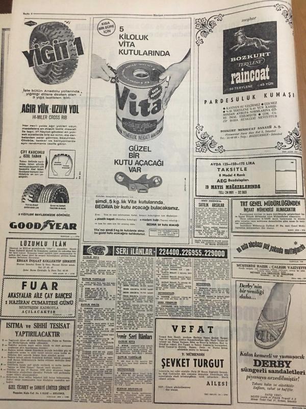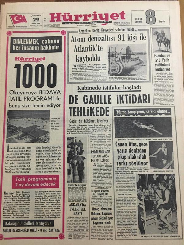 HÜRRİYET GAZETESİ 29 MAYIS 1968 YIL :21 SAYI :7214--Atom denizaltısı 91 kişi ile Atlantik te kayboldu --De Gaulle iktidarı tehlikede ---Canan Ateş ,gece yarısı denizden çıkıp ıslak ıslak şarkı söylüyor ---Partilerin ağır topları atışa devam ediyor---Haraç alamayan Hakimo ,kaçırdığı şahsın gözünü oyup boynunu vurdu ---İstanbul un 515 .Fetih Yıldönümü Kutlanıyor ---Belçika da 300 bin kadın patron var ---Benfica M.United ---Galatasaray kampında sıkı yönetim ---İkinci devre klasmanında Vefa lig üçüncüsü oldu ---Beşiktaşlılar ,Yusuf için 500 bin lira istedi ---Fenerbahçe kampa girdi AEK in gözü kupada ---Faruk a 200 bin lira vaadedilince Sami ben de 150 bin isterim dedi ---Tuzla da Bayramoğlu Oteli de emrinizde --İki öğrenci arasındaki şaka cinayetle bitti ---Ankara da evleri sel bastı --, SEDAT SİMAVİ tarafından kaleme alınmıştır. Kitap 1968 yılında [HÜRRİYET MATBAA] yayınlanmıştır. 8 sayfadır. HÜRRİYET GAZETESİ 29 MAYIS 1968 YIL :21 SAYI :7214--Atom denizaltısı 91 kişi ile Atlantik te kayboldu --De Gaulle iktidarı tehlikede ---Canan Ateş ,gece yarısı denizden çıkıp ıslak ıslak şarkı söylüyor ---Partilerin ağır topları atışa devam ediyor---Haraç alamayan Hakimo ,kaçırdığı şahsın gözünü oyup boynunu vurdu ---İstanbul un 515 .Fetih Yıldönümü Kutlanıyor ---Belçika da 300 bin kadın patron var ---Benfica M.United ---Galatasaray kampında sıkı yönetim ---İkinci devre klasmanında Vefa lig üçüncüsü oldu ---Beşiktaşlılar ,Yusuf için 500 bin lira istedi ---Fenerbahçe kampa girdi AEK in gözü kupada ---Faruk a 200 bin lira vaadedilince Sami ben de 150 bin isterim dedi ---Tuzla da Bayramoğlu Oteli de emrinizde --İki öğrenci arasındaki şaka cinayetle bitti ---Ankara da evleri sel bastı -- adlı eser Türkçe dilindedir.