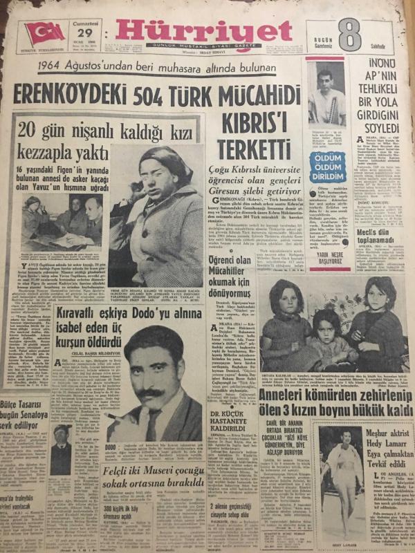 HÜRRİYET GAZETESİ 29 OCAK 1966 YIL :18 SAYI :6376---Erenköy de ki 504 Türk Mücahidi Kıbrıs ı Terk Etti ---20 gün nişanlı kaldığı kızı kezzapla yaktı ----Kravatlı eşkiya Dodo yu alnına isabet eden üç kurşun öldürdü ---İnönü AP nin Tehlikeli Bir Yola Girdiğini Söyledi ---Anneleri kömürden zehirlenip ölen 3 kızını boynu bükük kaldı ---Ali Sami Yen Stadyumunun Otopark Konusu Hallediliyor ---Darülacezeye gitmek istemeyen İngiliz Kemal Bakırköy e yatırılacak ---Fotoğraf dalında gümüş plaketi Alaettin Büte kazandı ---İnsanlardan nefret eden kadın 1 milyon lira tutan servetini hayvanlara bıraktı ----Galatasaray -İst.Spor Oynuyor ---Ordu Takımımız Bağdat ta Irak ı 3-1 mağlup etti ---Necmi Mutlu :Özlediğimiz şampiyonluğa kavuşacağız --Profesyonel Kulüplerin bir an önce şirket haline getirilmesi isteniyor ---Göksel Arsoy ay sonunda ilk plağını dolduruyor ---Şehvetin Esiriyiz --Bir İtalya Film şirketi Boğaz da Film çevirecek ---Neden evlenmiyorlar : Türkan Şoray ,Hülya Koçyiğit ,Ajda Pekkan -- Yıpranma, sararmalar, kupon kesiği ve yırtılmalar zamana bağlı olarak görülebilir.