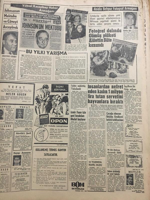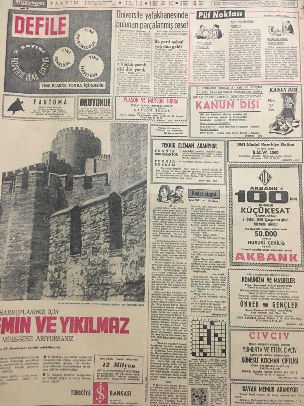 HÜRRİYET GAZETESİ 29 OCAK 1966 YIL :18 SAYI :6376---Erenköy de ki 504 Türk Mücahidi Kıbrıs ı Terk Etti ---20 gün nişanlı kaldığı kızı kezzapla yaktı ----Kravatlı eşkiya Dodo yu alnına isabet eden üç kurşun öldürdü ---İnönü AP nin Tehlikeli Bir Yola Girdiğini Söyledi ---Anneleri kömürden zehirlenip ölen 3 kızını boynu bükük kaldı ---Ali Sami Yen Stadyumunun Otopark Konusu Hallediliyor ---Darülacezeye gitmek istemeyen İngiliz Kemal Bakırköy e yatırılacak ---Fotoğraf dalında gümüş plaketi Alaettin Büte kazandı ---İnsanlardan nefret eden kadın 1 milyon lira tutan servetini hayvanlara bıraktı ----Galatasaray -İst.Spor Oynuyor ---Ordu Takımımız Bağdat ta Irak ı 3-1 mağlup etti ---Necmi Mutlu :Özlediğimiz şampiyonluğa kavuşacağız --Profesyonel Kulüplerin bir an önce şirket haline getirilmesi isteniyor ---Göksel Arsoy ay sonunda ilk plağını dolduruyor ---Şehvetin Esiriyiz --Bir İtalya Film şirketi Boğaz da Film çevirecek ---Neden evlenmiyorlar : Türkan Şoray ,Hülya Koçyiğit ,Ajda Pekkan --, SEDAT SİMAVİ tarafından kaleme alınmıştır. Kitap 1966 yılında [HÜRRİYET MATBAA] yayınlanmıştır. 8 sayfadır. HÜRRİYET GAZETESİ 29 OCAK 1966 YIL :18 SAYI :6376---Erenköy de ki 504 Türk Mücahidi Kıbrıs ı Terk Etti ---20 gün nişanlı kaldığı kızı kezzapla yaktı ----Kravatlı eşkiya Dodo yu alnına isabet eden üç kurşun öldürdü ---İnönü AP nin Tehlikeli Bir Yola Girdiğini Söyledi ---Anneleri kömürden zehirlenip ölen 3 kızını boynu bükük kaldı ---Ali Sami Yen Stadyumunun Otopark Konusu Hallediliyor ---Darülacezeye gitmek istemeyen İngiliz Kemal Bakırköy e yatırılacak ---Fotoğraf dalında gümüş plaketi Alaettin Büte kazandı ---İnsanlardan nefret eden kadın 1 milyon lira tutan servetini hayvanlara bıraktı ----Galatasaray -İst.Spor Oynuyor ---Ordu Takımımız Bağdat ta Irak ı 3-1 mağlup etti ---Necmi Mutlu :Özlediğimiz şampiyonluğa kavuşacağız --Profesyonel Kulüplerin bir an önce şirket haline getirilmesi isteniyor ---Göksel Arsoy ay sonunda ilk plağını dolduruyor ---Şehvetin Esiriyiz --Bir İtalya Film şirketi Boğaz da Film çevirecek ---Neden evlenmiyorlar : Türkan Şoray ,Hülya Koçyiğit ,Ajda Pekkan -- adlı eser Türkçe dilindedir.