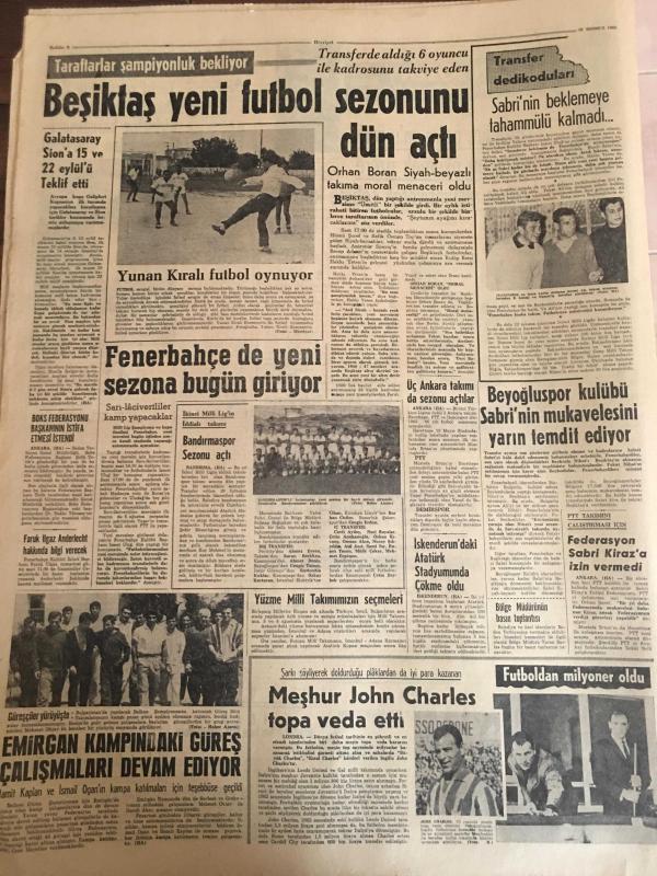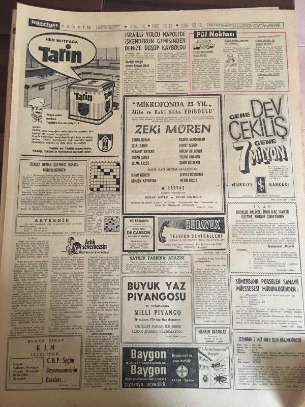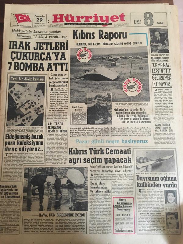 HÜRRİYET GAZETESİ 29 TEMMUZ 1965 YIL :18 SAYI :6194--Irak jetleri Çukurca ya 7 bomba attı ---Kıbrıs Raporu --El değmemiş bozuk para koleksiyonu ihraç ediyoruz ---Kıbrıs Türk Cemaati ayrı seçim yapacak ---Almanya da ki işçilerimiz bu yıl 500 milyon lira gönderecek ---Bursa olayı sanıklarından 8 i tahliye edildi --Dayısının oğlunu kalbinden vurdu --CKMP Nazı Tarzı ile ele geçirilmek isteniyor --Oğlunu öldüren emekli yarbay 20 yıla mahkum oldu ---Aşı kampanyasına 2 Ağustos pazartesi günü başlanıyor ---İsrailli Yolcu Napoli de İskenderun gemisinden denize düşüp kayboldu --Mikrofonda 25 .Yıl :Zeki Müren ---Beşiktaş yeni futbol sezonunu dün açtı --Fenerbahçe de yeni sezona bugün giriliyor --Beyoğluspor kulübü Sabri nin mukavelesini yarın temdit ediyor --İskenderun da ki Atatürk Stadyumunda Çökme Oldu --Emirgan kampındaki güreş çalışmaları devam ediyor --Meşhur John Charles topa veda etti --Federasyon Sabri Kiraz a izin vermedi ---Sosyete Gülü ,Aşığı ile Bir Olup Kocasını Öldürdü -- Yıpranma, sararmalar, kupon kesiği ve yırtılmalar zamana bağlı olarak görülebilir.