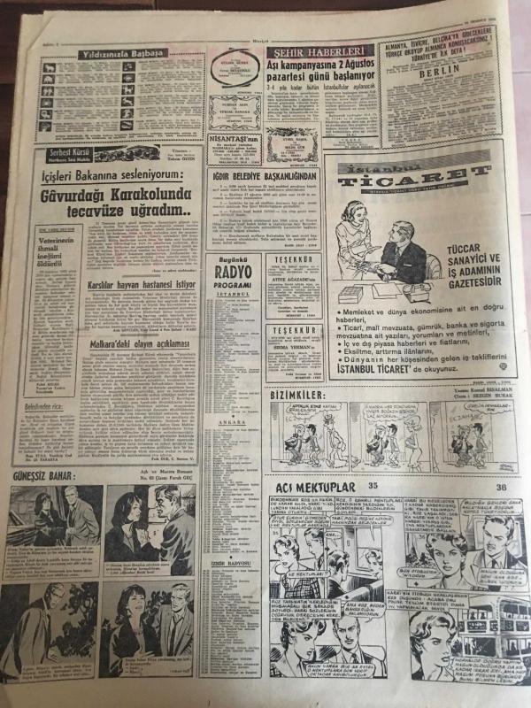 HÜRRİYET GAZETESİ 29 TEMMUZ 1965-Suzan Sözen--Irak jetleri Çukurca ya 7 bomba attı ---Kıbrıs Raporu --El değmemiş bozuk para koleksiyonu ihraç ediyoruz ---Kıbrıs Türk Cemaati ayrı seçim yapacak ---Almanya da ki işçilerimiz bu yıl 500 milyon lira gönderecek ---Bursa olayı sanıklarından 8 i tahliye edildi --Dayısının oğlunu kalbinden vurdu --CKMP Nazı Tarzı ile ele geçirilmek isteniyor --Oğlunu öldüren emekli yarbay 20 yıla mahkum oldu ---Aşı kampanyasına 2 Ağustos pazartesi günü başlanıyor ---İsrailli Yolcu Napoli de İskenderun gemisinden denize düşüp kayboldu --Mikrofonda 25 .Yıl :Zeki Müren ---Beşiktaş yeni futbol sezonunu dün açtı --Fenerbahçe de yeni sezona bugün giriliyor --Beyoğluspor kulübü Sabri nin mukavelesini yarın temdit ediyor --İskenderun da ki Atatürk Stadyumunda Çökme Oldu --Emirgan kampındaki güreş çalışmaları devam ediyor --Meşhur John Charles topa veda etti --Federasyon Sabri Kiraz a izin vermedi ---Sosyete Gülü ,Aşığı ile Bir Olup Kocasını Öldürdü -- adlı eser, Kitap > Süreli Yayınlar > Gazeteler > Türkiye > Genel > Günlük kategorisinde İkinci El olarak satıştadır.