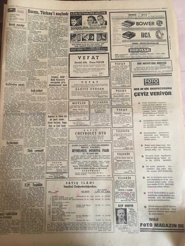 HÜRRİYET GAZETESİ 29 TEMMUZ 1965-Suzan Sözen--Irak jetleri Çukurca ya 7 bomba attı ---Kıbrıs Raporu --El değmemiş bozuk para koleksiyonu ihraç ediyoruz ---Kıbrıs Türk Cemaati ayrı seçim yapacak ---Almanya da ki işçilerimiz bu yıl 500 milyon lira gönderecek ---Bursa olayı sanıklarından 8 i tahliye edildi --Dayısının oğlunu kalbinden vurdu --CKMP Nazı Tarzı ile ele geçirilmek isteniyor --Oğlunu öldüren emekli yarbay 20 yıla mahkum oldu ---Aşı kampanyasına 2 Ağustos pazartesi günü başlanıyor ---İsrailli Yolcu Napoli de İskenderun gemisinden denize düşüp kayboldu --Mikrofonda 25 .Yıl :Zeki Müren ---Beşiktaş yeni futbol sezonunu dün açtı --Fenerbahçe de yeni sezona bugün giriliyor --Beyoğluspor kulübü Sabri nin mukavelesini yarın temdit ediyor --İskenderun da ki Atatürk Stadyumunda Çökme Oldu --Emirgan kampındaki güreş çalışmaları devam ediyor --Meşhur John Charles topa veda etti --Federasyon Sabri Kiraz a izin vermedi ---Sosyete Gülü ,Aşığı ile Bir Olup Kocasını Öldürdü --, SEDAT SİMAVİ tarafından kaleme alınmıştır. Kitap 1965 yılında [HÜRRİYET MATBAA] yayınlanmıştır. 8 sayfadır. HÜRRİYET GAZETESİ 29 TEMMUZ 1965-Suzan Sözen--Irak jetleri Çukurca ya 7 bomba attı ---Kıbrıs Raporu --El değmemiş bozuk para koleksiyonu ihraç ediyoruz ---Kıbrıs Türk Cemaati ayrı seçim yapacak ---Almanya da ki işçilerimiz bu yıl 500 milyon lira gönderecek ---Bursa olayı sanıklarından 8 i tahliye edildi --Dayısının oğlunu kalbinden vurdu --CKMP Nazı Tarzı ile ele geçirilmek isteniyor --Oğlunu öldüren emekli yarbay 20 yıla mahkum oldu ---Aşı kampanyasına 2 Ağustos pazartesi günü başlanıyor ---İsrailli Yolcu Napoli de İskenderun gemisinden denize düşüp kayboldu --Mikrofonda 25 .Yıl :Zeki Müren ---Beşiktaş yeni futbol sezonunu dün açtı --Fenerbahçe de yeni sezona bugün giriliyor --Beyoğluspor kulübü Sabri nin mukavelesini yarın temdit ediyor --İskenderun da ki Atatürk Stadyumunda Çökme Oldu --Emirgan kampındaki güreş çalışmaları devam ediyor --Meşhur John Charles topa veda etti --Federasyon Sabri Kiraz a izin vermedi ---Sosyete Gülü ,Aşığı ile Bir Olup Kocasını Öldürdü -- adlı eser Türkçe dilindedir.