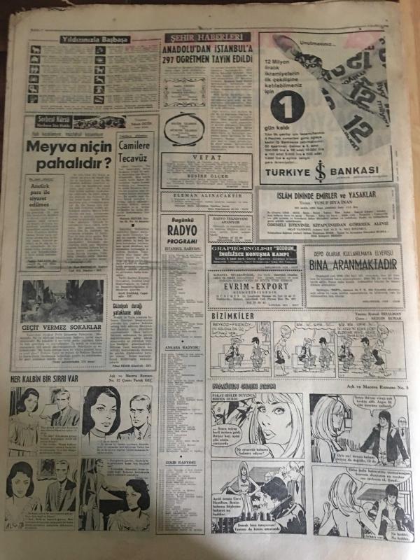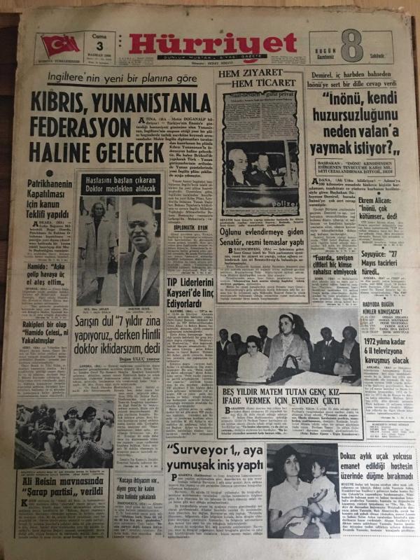 HÜRRİYET GAZETESİ 3 HAZİRAN 1966 YIL :19 SAYI :6498---Kıbrıs ,Yunanistan la Federasyon Haline Gelecek ---Patrikhanenin kapatılması için kanun teklifi yapıldı ---İnönü ,kendi huzursuzluğunu neden vatan a yaymak istiyor ?---TİP Liderlerini Kayseri de linç ediyorlardı ---Ali Reisin mavnasında şarap partisi verildi ---Surveyor 1 aya yumuşak iniş yaptı ---Beş yıldır matem tutan genç kız ifade vermek için evinden çıktı ---1972 yılına kadar 6 il televizyona kavuşmuş olacak ---Fuarda sevişen çiftleri hiç kimse rahatsız etmeyecek ---Anadolu dan İstanbul a 297 Öğretmen Tayin Oldu ----Hind li zengin ihtiyarlarla kız satan şebeke yakalandı --Eskişehirspor bugün Mersin e Gidiyor --Fenerbahçe nin tertibi belli oldu --A.Ordulular Engelleri bu haftaki maça çağırıyor ---Kupada Gençlerbirliği Takımı da Söz Sahibidir --Düğünde eşine lokanta hediye etti ---İçip içip sarhoş olan küçük çocuk balkondan düştü ---Kocaya ihtiyacım var diyen kadın zina halinde yakalandı -- Yıpranma, sararmalar, kupon kesiği ve yırtılmalar zamana bağlı olarak görülebilir.