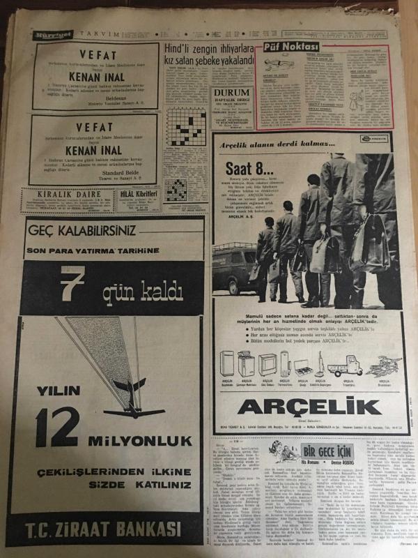 HÜRRİYET GAZETESİ 3 HAZİRAN 1966 YIL :19 SAYI :6498---Kıbrıs ,Yunanistan la Federasyon Haline Gelecek ---Patrikhanenin kapatılması için kanun teklifi yapıldı ---İnönü ,kendi huzursuzluğunu neden vatan a yaymak istiyor ?---TİP Liderlerini Kayseri de linç ediyorlardı ---Ali Reisin mavnasında şarap partisi verildi ---Surveyor 1 aya yumuşak iniş yaptı ---Beş yıldır matem tutan genç kız ifade vermek için evinden çıktı ---1972 yılına kadar 6 il televizyona kavuşmuş olacak ---Fuarda sevişen çiftleri hiç kimse rahatsız etmeyecek ---Anadolu dan İstanbul a 297 Öğretmen Tayin Oldu ----Hind li zengin ihtiyarlarla kız satan şebeke yakalandı --Eskişehirspor bugün Mersin e Gidiyor --Fenerbahçe nin tertibi belli oldu --A.Ordulular Engelleri bu haftaki maça çağırıyor ---Kupada Gençlerbirliği Takımı da Söz Sahibidir --Düğünde eşine lokanta hediye etti ---İçip içip sarhoş olan küçük çocuk balkondan düştü ---Kocaya ihtiyacım var diyen kadın zina halinde yakalandı --, SEDAT SİMAVİ tarafından kaleme alınmıştır. Kitap 1966 yılında [HÜRRİYET MATBAA] yayınlanmıştır. 8 sayfadır. HÜRRİYET GAZETESİ 3 HAZİRAN 1966 YIL :19 SAYI :6498---Kıbrıs ,Yunanistan la Federasyon Haline Gelecek ---Patrikhanenin kapatılması için kanun teklifi yapıldı ---İnönü ,kendi huzursuzluğunu neden vatan a yaymak istiyor ?---TİP Liderlerini Kayseri de linç ediyorlardı ---Ali Reisin mavnasında şarap partisi verildi ---Surveyor 1 aya yumuşak iniş yaptı ---Beş yıldır matem tutan genç kız ifade vermek için evinden çıktı ---1972 yılına kadar 6 il televizyona kavuşmuş olacak ---Fuarda sevişen çiftleri hiç kimse rahatsız etmeyecek ---Anadolu dan İstanbul a 297 Öğretmen Tayin Oldu ----Hind li zengin ihtiyarlarla kız satan şebeke yakalandı --Eskişehirspor bugün Mersin e Gidiyor --Fenerbahçe nin tertibi belli oldu --A.Ordulular Engelleri bu haftaki maça çağırıyor ---Kupada Gençlerbirliği Takımı da Söz Sahibidir --Düğünde eşine lokanta hediye etti ---İçip içip sarhoş olan küçük çocuk balkondan düştü ---Kocaya ihtiyacım var diyen kadın zina halinde yakalandı -- adlı eser Türkçe dilindedir.