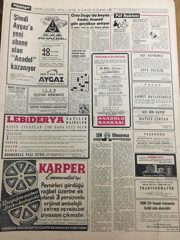 HÜRRİYET GAZETESİ 3 MART 1967 YIL :19 SAYI :6769--Demirel ,9 Bakanı Değiştiriyor --Haile Selasiye Geldi ---Altın Mikrofon Kervanı Ankara da ---Tansel : Gizli kalan hususların Millet tarafından öğrenilmesine memnunum --Bir öğretmeni ,sevdiği kızın babası öldürdü ---Bir çok doktor ilaç fabrikalarına ortak --Vehbi Koç un çıkık omuzu yerine oturtuldu ---Gangster Yılmaz ın emekli polis babası ile kardeşi de Adana da nezarete alındı --Çocuk düşürmek için kullandığı derece kırılınca genç kadın ölümden zor kurtuldu ---37 Bin kaçak inşaatı İmar da kabul ediyor ---Orta Doğu da beyaz kadın ticareti gün geçtikçe artıyor ----Beşiktaş ve Galatasaray kampta --Apak :3 .Türkiye ligini kurmayı düşünüyoruz --Real i eleyen İnter dömifinale kaldı ---Eskişehirspor Ankara ya 5 Bin Taraftarla Gidiyor --Altaylı Varol 20 Gün Ceza Aldı --Muhammed Ali Clay Yenilmediği Taktirde Önümüzdeki Yıl Boksu Bırakacak --Afrika da dost bir ülke :Habeşistan ---Demirel ,devlet çarkına hız verilmesini istedi --, SEDAT SİMAVİ tarafından kaleme alınmıştır. Kitap 1967 yılında [HÜRRİYET MATBAA] yayınlanmıştır. 8 sayfadır. HÜRRİYET GAZETESİ 3 MART 1967 YIL :19 SAYI :6769--Demirel ,9 Bakanı Değiştiriyor --Haile Selasiye Geldi ---Altın Mikrofon Kervanı Ankara da ---Tansel : Gizli kalan hususların Millet tarafından öğrenilmesine memnunum --Bir öğretmeni ,sevdiği kızın babası öldürdü ---Bir çok doktor ilaç fabrikalarına ortak --Vehbi Koç un çıkık omuzu yerine oturtuldu ---Gangster Yılmaz ın emekli polis babası ile kardeşi de Adana da nezarete alındı --Çocuk düşürmek için kullandığı derece kırılınca genç kadın ölümden zor kurtuldu ---37 Bin kaçak inşaatı İmar da kabul ediyor ---Orta Doğu da beyaz kadın ticareti gün geçtikçe artıyor ----Beşiktaş ve Galatasaray kampta --Apak :3 .Türkiye ligini kurmayı düşünüyoruz --Real i eleyen İnter dömifinale kaldı ---Eskişehirspor Ankara ya 5 Bin Taraftarla Gidiyor --Altaylı Varol 20 Gün Ceza Aldı --Muhammed Ali Clay Yenilmediği Taktirde Önümüzdeki Yıl Boksu Bırakacak --Afrika da dost bir ülke :Habeşistan ---Demirel ,devlet çarkına hız verilmesini istedi -- adlı eser Türkçe dilindedir.
