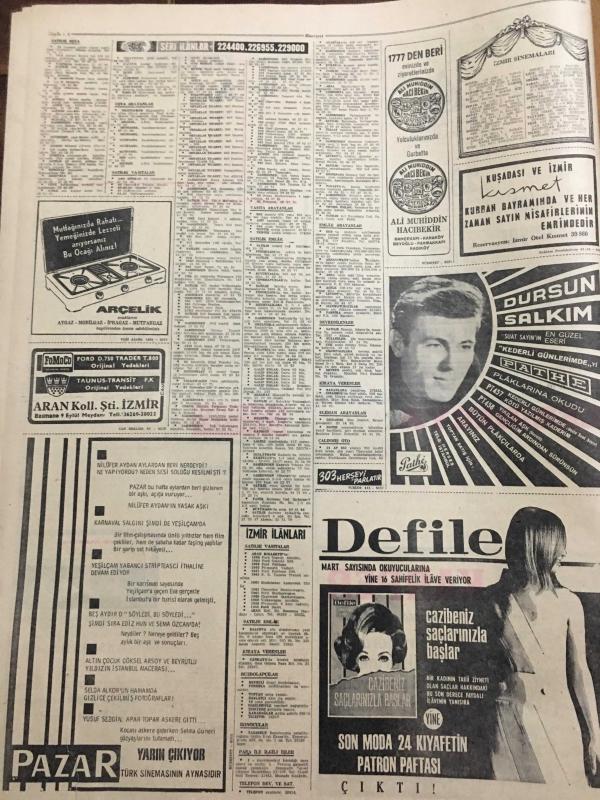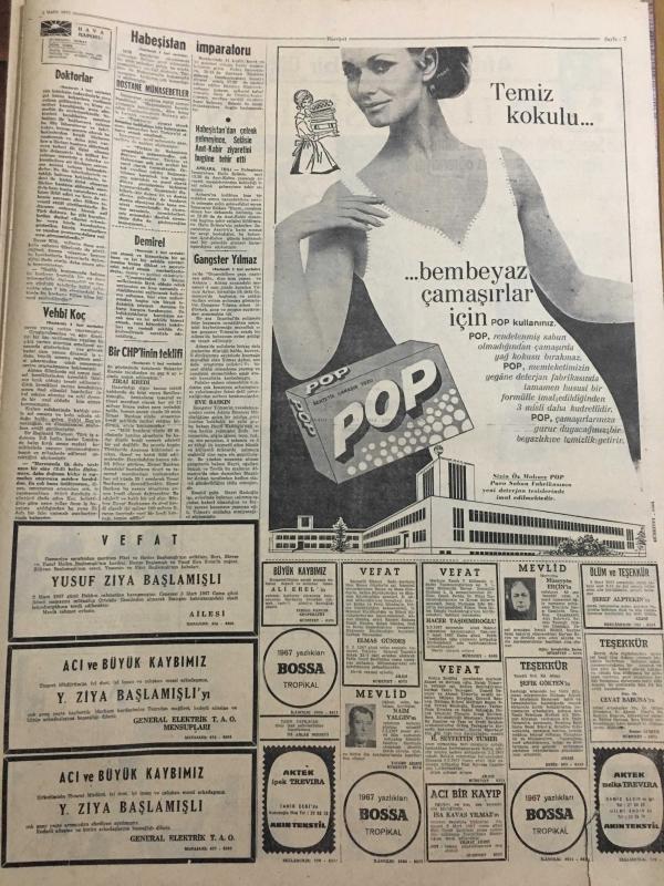 HÜRRİYET GAZETESİ 3 MART 1967 YIL :19 SAYI :6769--Demirel ,9 Bakanı Değiştiriyor --Haile Selasiye Geldi ---Altın Mikrofon Kervanı Ankara da ---Tansel : Gizli kalan hususların Millet tarafından öğrenilmesine memnunum --Bir öğretmeni ,sevdiği kızın babası öldürdü ---Bir çok doktor ilaç fabrikalarına ortak --Vehbi Koç un çıkık omuzu yerine oturtuldu ---Gangster Yılmaz ın emekli polis babası ile kardeşi de Adana da nezarete alındı --Çocuk düşürmek için kullandığı derece kırılınca genç kadın ölümden zor kurtuldu ---37 Bin kaçak inşaatı İmar da kabul ediyor ---Orta Doğu da beyaz kadın ticareti gün geçtikçe artıyor ----Beşiktaş ve Galatasaray kampta --Apak :3 .Türkiye ligini kurmayı düşünüyoruz --Real i eleyen İnter dömifinale kaldı ---Eskişehirspor Ankara ya 5 Bin Taraftarla Gidiyor --Altaylı Varol 20 Gün Ceza Aldı --Muhammed Ali Clay Yenilmediği Taktirde Önümüzdeki Yıl Boksu Bırakacak --Afrika da dost bir ülke :Habeşistan ---Demirel ,devlet çarkına hız verilmesini istedi -- Yıpranma, sararmalar, kupon kesiği ve yırtılmalar zamana bağlı olarak görülebilir.