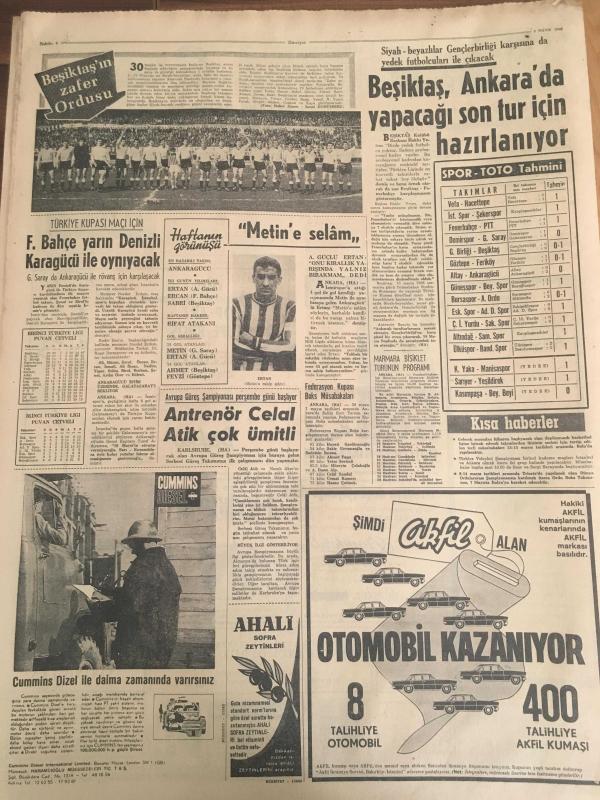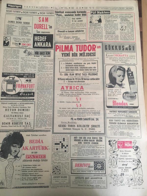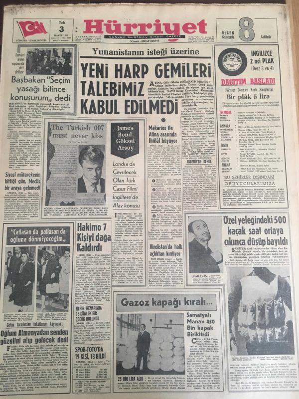 HÜRRİYET GAZETESİ 3 MAYIS 1966 YIL :19 SAYI :6467--Başbakan seçim yasağı bitince konuşurum dedi ---Yeni Harp Gemileri Talebimiz Kabul Edilmedi --Siyasi mütarekenin bittiği gün ,Meclis bir araya gelemedi --Hakimo 7 kişiyi dağa kaldırdı --Oğlum Almanya dan senden güzelini alıp gelecek dedi --Makarios ile Atina arasında ihtilaf büyüyor --Hindistan da halk açlıktan kırılıyor --Özel yeleğinde 500 kaçak saat ortaya çıkınca düşüp bayıldı ---Nehir kenarında 15 günlük bir çocuk bulundu --Gazoz kapağı kralı --Ameliyat esnasında karnında pens unutulan kadın öldü ---Halk Türküleri Sanatkarı : Bedia Akartürk ---Popüler Sanatkar : Erol Büyükburç ---Beşiktaş ,Ankara da yapacağı son tur için hazırlanıyor --Fenerbahçe yarın Denizli Karagücü ile oynayacak ---Antrenör Celal Atik çok ümitli --Objektifle Anadolu --Londra da çevrilecek olan Türk casus filmi İngiltere alay konusu --Spor -Toto da 19 kişi ,13 bildi -- Yıpranma, sararmalar, kupon kesiği ve yırtılmalar zamana bağlı olarak görülebilir.