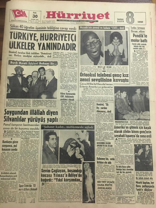 HÜRRİYET GAZETESİ 30 KASIM 1965 YIL :18 SAYI :6318---Türkiye ,Hürriyetçi ülkeler yanındadır --Soygundan illallah diyen Silvanlılar yürüyüş yaptı ---Ortaokul talebesi genç kız zenci sevgilisine kavuştu ---Pendik te motor battı ---Bankaya giren soyguncu ,pul kasasını soydu ---Sevim Çağlayan ,boşandığı kocası Yılmaz a Adliye de bağırdı :Yıkıl karşımdan ---Amerika ya gitmek için kaçak olarak şilebe binen gençlerin seyahati İspanya da sona erdi ---Mısırlı kaptan ,her hava patlayışında İzmir e düşüyor ---Ahşap binalar oda oda kiraya verilmeyecek ---Hapisaneye helikopter indirme işi suya düştü ---İzmir de sinemalar --Hold ,İzm.Sporla Anlaşıyor---Fenerbahçe ve Galatasaray ın maç hazırlığı bu sabah başlıyor ---Boğaziçi Basketbol Turnuvası ---Pendik te motor battı ---Yıldızlar arasında dizkapağı yarışı başladı --Kıbrıs konusunda CHP hükümete yardımcı olacak --Demirel ,Ek Dış Yardım Almıyoruz Dedi ---Bir THY uçağı daha pistte arızalandı -- Yıpranma, sararmalar, kupon kesiği ve yırtılmalar zamana bağlı olarak görülebilir.