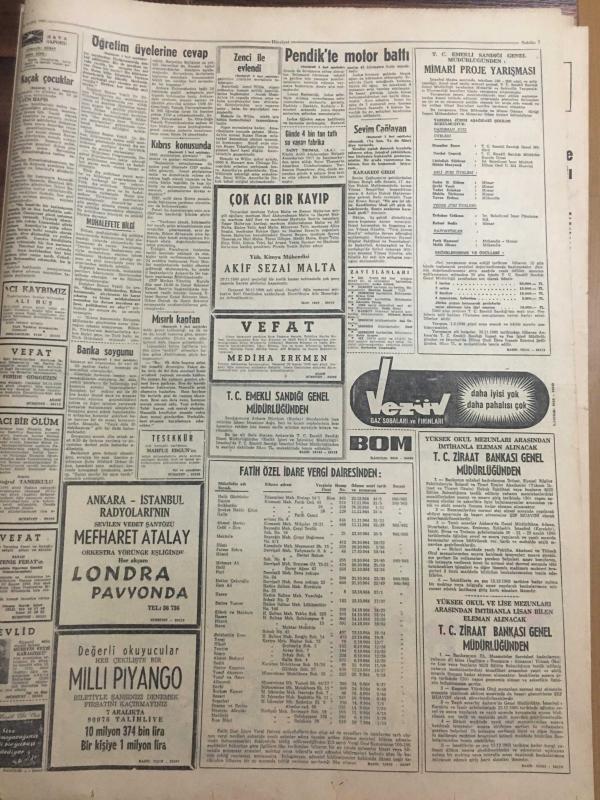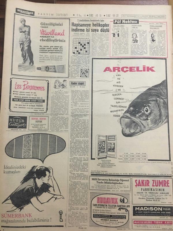 HÜRRİYET GAZETESİ 30 KASIM 1965 YIL :18 SAYI :6318---Türkiye ,Hürriyetçi ülkeler yanındadır --Soygundan illallah diyen Silvanlılar yürüyüş yaptı ---Ortaokul talebesi genç kız zenci sevgilisine kavuştu ---Pendik te motor battı ---Bankaya giren soyguncu ,pul kasasını soydu ---Sevim Çağlayan ,boşandığı kocası Yılmaz a Adliye de bağırdı :Yıkıl karşımdan ---Amerika ya gitmek için kaçak olarak şilebe binen gençlerin seyahati İspanya da sona erdi ---Mısırlı kaptan ,her hava patlayışında İzmir e düşüyor ---Ahşap binalar oda oda kiraya verilmeyecek ---Hapisaneye helikopter indirme işi suya düştü ---İzmir de sinemalar --Hold ,İzm.Sporla Anlaşıyor---Fenerbahçe ve Galatasaray ın maç hazırlığı bu sabah başlıyor ---Boğaziçi Basketbol Turnuvası ---Pendik te motor battı ---Yıldızlar arasında dizkapağı yarışı başladı --Kıbrıs konusunda CHP hükümete yardımcı olacak --Demirel ,Ek Dış Yardım Almıyoruz Dedi ---Bir THY uçağı daha pistte arızalandı --, SEDAT SİMAVİ tarafından kaleme alınmıştır. Kitap 1965 yılında [HÜRRİYET MATBAA] yayınlanmıştır. 8 sayfadır. HÜRRİYET GAZETESİ 30 KASIM 1965 YIL :18 SAYI :6318---Türkiye ,Hürriyetçi ülkeler yanındadır --Soygundan illallah diyen Silvanlılar yürüyüş yaptı ---Ortaokul talebesi genç kız zenci sevgilisine kavuştu ---Pendik te motor battı ---Bankaya giren soyguncu ,pul kasasını soydu ---Sevim Çağlayan ,boşandığı kocası Yılmaz a Adliye de bağırdı :Yıkıl karşımdan ---Amerika ya gitmek için kaçak olarak şilebe binen gençlerin seyahati İspanya da sona erdi ---Mısırlı kaptan ,her hava patlayışında İzmir e düşüyor ---Ahşap binalar oda oda kiraya verilmeyecek ---Hapisaneye helikopter indirme işi suya düştü ---İzmir de sinemalar --Hold ,İzm.Sporla Anlaşıyor---Fenerbahçe ve Galatasaray ın maç hazırlığı bu sabah başlıyor ---Boğaziçi Basketbol Turnuvası ---Pendik te motor battı ---Yıldızlar arasında dizkapağı yarışı başladı --Kıbrıs konusunda CHP hükümete yardımcı olacak --Demirel ,Ek Dış Yardım Almıyoruz Dedi ---Bir THY uçağı daha pistte arızalandı -- adlı eser Türkçe dilindedir.