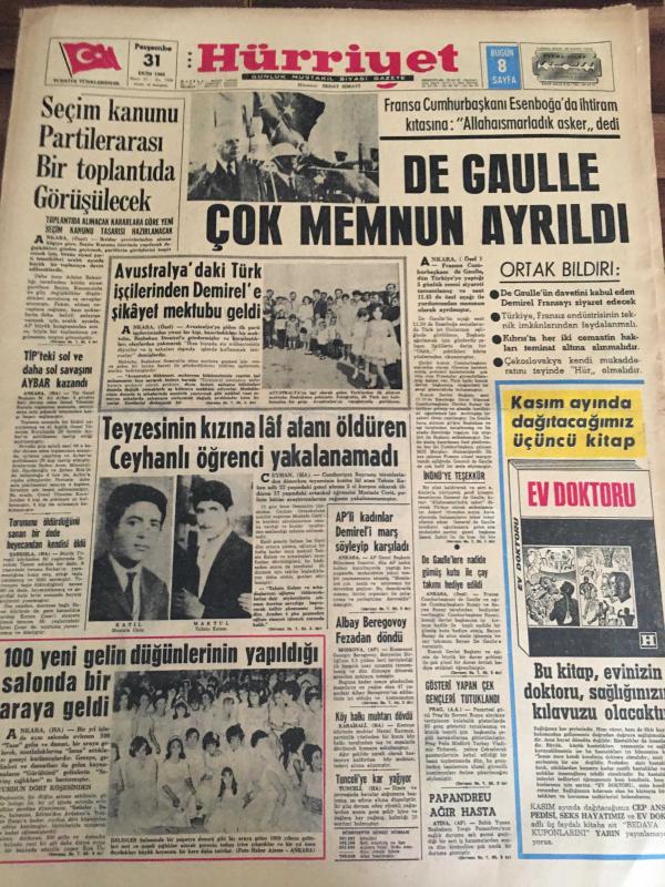 HÜRRİYET GAZETESİ 31 EKİM 1968 YIL :21 SAYI :7369---Seçim Kanunu Partiler Arası Bir Toplantıda Görüşülecek -- De Gaulle Çok Memnun Ayrıldı ----Avusturalya 'da ki Türk işçilerinden Demirel 'e şikayet mektubu geldi ----100 yeni gelin düğünlerinin yapıldığı salonda bir araya geldi ---AP 'li kadınlar Demirel 'i marş söyleyip karşıladı ---Tunceli 'ye kar yağıyor ---Ev Doktoru :Bu kitap ,evinizin doktoru , sağlığınızın kılavuzu olacaktır ----Albay Beregovoy Ferzadan döndü ----TİP 'te ki sol ve daha sol savaşını AYBAR kazandı ---Galatasaray Kütahya 'da şaşkına döndü :4-3--- Ceza Varsa Biz Yokuz ---UEFA 'nın İstanbul 'da toplanması futbolumuz için büyük başarıdır ---Altay Samsun 'a fark yaptı :3-0----Sabri Kiraz Galatasaray 'yı yenmek için oynayacağız dedi ----Rumenlerin ümidi Alsancak ta söndü :3-0----Kavga ettiği arkadaşını bir yumrukla öldürdü ---- Lidya devrine ait eserler bulundu --- Yıpranma, sararmalar, kupon kesiği ve yırtılmalar zamana bağlı olarak görülebilir.