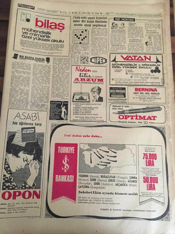 HÜRRİYET GAZETESİ 31 EKİM 1968 YIL :21 SAYI :7369--Dursun Salkım fotoğraflı sevilen plak reklamı-Seçim Kanunu Partiler Arası Bir Toplantıda Görüşülecek -- De Gaulle Çok Memnun Ayrıldı ----Avusturalya 'da ki Türk işçilerinden Demirel 'e şikayet mektubu geldi ----100 yeni gelin düğünlerinin yapıldığı salonda bir araya geldi ---AP 'li kadınlar Demirel 'i marş söyleyip karşıladı ---Tunceli 'ye kar yağıyor ---Ev Doktoru :Bu kitap ,evinizin doktoru , sağlığınızın kılavuzu olacaktır ----Albay Beregovoy Ferzadan döndü ----TİP 'te ki sol ve daha sol savaşını AYBAR kazandı ---Galatasaray Kütahya 'da şaşkına döndü :4-3--- Ceza Varsa Biz Yokuz ---UEFA 'nın İstanbul 'da toplanması futbolumuz için büyük başarıdır ---Altay Samsun 'a fark yaptı :3-0----Sabri Kiraz Galatasaray 'yı yenmek için oynayacağız dedi ----Rumenlerin ümidi Alsancak ta söndü :3-0----Kavga ettiği arkadaşını bir yumrukla öldürdü ---- Lidya devrine ait eserler bulundu --- adlı eser, Kitap > Süreli Yayınlar > Gazeteler > Türkiye > Genel > Günlük kategorisinde İkinci El olarak satıştadır.