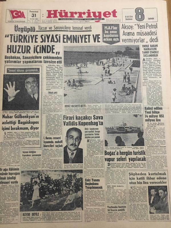 HÜRRİYET GAZETESİ 31 MAYIS 1965 YIL :18 SAYI :6135--Türkiye siyasi emniyet ve huzur içinde ---Aksoy :Yeni Petrol Arama Müsaadesi Vermiyorlar Dedi ---Nubar Gülbenkyan ın azlettiği Başpiskopos işimi bırakmam diyor ---Firari kaçakçı Sava Vafidis Kopenhag ta ---Bir ağa hakimin önünde toprağını almak istediği milyoneri vurdu ----Boğaz a her gün turistik vapur seferi yapılacak --Şüpheden kurtulmak için katili ihbar edene otuz bin lira verecekler ----Kabul edilen yeni bütçe 14 milyar 851 milyon lira ----Denizcilik Bankası gemileri bir ayda 65 bin yolcu taşıdı --Çeteciler ,iki Vietnam bölüğünü imha ettiler ---Milli Ligi Bu Yıl da Fenerbahçe Kazandı --Beykoz un ümidi arttı ---Galatasaray :1 PTT :1--- Feriköy G.Birliğini de yendi : 3-1---5. Antalya Festivaline On Film İştirak Edecek ---Jackie ,hala Amerika nın 1 numaralı kadını ---Ali Han ın sevgilsi Bettina ,foto muhabirliği ile hayatını kazanıyor ---, SEDAT SİMAVİ tarafından kaleme alınmıştır. Kitap 1965 yılında [HÜRRİYET MATBAA] yayınlanmıştır. 8 sayfadır. HÜRRİYET GAZETESİ 31 MAYIS 1965 YIL :18 SAYI :6135--Türkiye siyasi emniyet ve huzur içinde ---Aksoy :Yeni Petrol Arama Müsaadesi Vermiyorlar Dedi ---Nubar Gülbenkyan ın azlettiği Başpiskopos işimi bırakmam diyor ---Firari kaçakçı Sava Vafidis Kopenhag ta ---Bir ağa hakimin önünde toprağını almak istediği milyoneri vurdu ----Boğaz a her gün turistik vapur seferi yapılacak --Şüpheden kurtulmak için katili ihbar edene otuz bin lira verecekler ----Kabul edilen yeni bütçe 14 milyar 851 milyon lira ----Denizcilik Bankası gemileri bir ayda 65 bin yolcu taşıdı --Çeteciler ,iki Vietnam bölüğünü imha ettiler ---Milli Ligi Bu Yıl da Fenerbahçe Kazandı --Beykoz un ümidi arttı ---Galatasaray :1 PTT :1--- Feriköy G.Birliğini de yendi : 3-1---5. Antalya Festivaline On Film İştirak Edecek ---Jackie ,hala Amerika nın 1 numaralı kadını ---Ali Han ın sevgilsi Bettina ,foto muhabirliği ile hayatını kazanıyor --- adlı eser Türkçe dilindedir.
