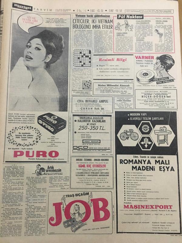 HÜRRİYET GAZETESİ 31 MAYIS 1965 YIL :18 SAYI :6135--Türkiye siyasi emniyet ve huzur içinde ---Aksoy :Yeni Petrol Arama Müsaadesi Vermiyorlar Dedi ---Nubar Gülbenkyan ın azlettiği Başpiskopos işimi bırakmam diyor ---Firari kaçakçı Sava Vafidis Kopenhag ta ---Bir ağa hakimin önünde toprağını almak istediği milyoneri vurdu ----Boğaz a her gün turistik vapur seferi yapılacak --Şüpheden kurtulmak için katili ihbar edene otuz bin lira verecekler ----Kabul edilen yeni bütçe 14 milyar 851 milyon lira ----Denizcilik Bankası gemileri bir ayda 65 bin yolcu taşıdı --Çeteciler ,iki Vietnam bölüğünü imha ettiler ---Milli Ligi Bu Yıl da Fenerbahçe Kazandı --Beykoz un ümidi arttı ---Galatasaray :1 PTT :1--- Feriköy G.Birliğini de yendi : 3-1---5. Antalya Festivaline On Film İştirak Edecek ---Jackie ,hala Amerika nın 1 numaralı kadını ---Ali Han ın sevgilsi Bettina ,foto muhabirliği ile hayatını kazanıyor --- Yıpranma, sararmalar, kupon kesiği ve yırtılmalar zamana bağlı olarak görülebilir.