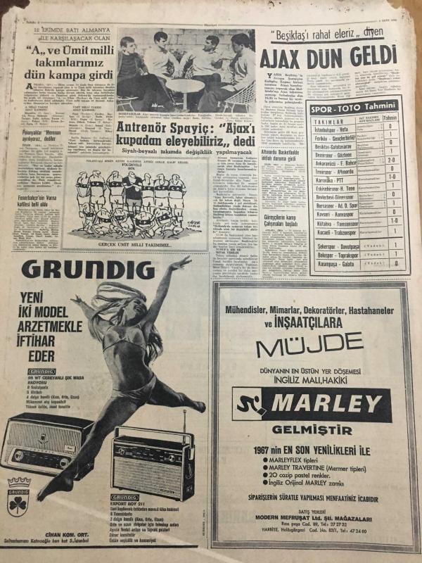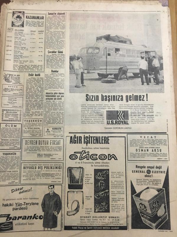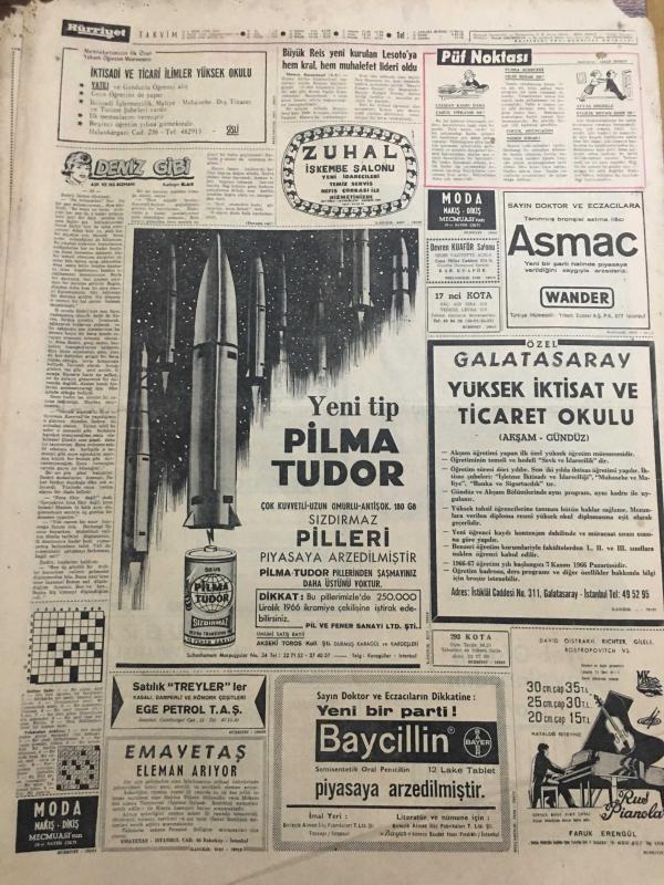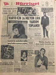 HÜRRİYET GAZETESİ 4 EKİM 1966 YIL : 19 SAYI :6621--Sunay ,İran da Şah ın Babası Rıza Şah ın Kabrini Ziyaret Etti ----Varto için 26 Milyon Lira Yardım Toplandı --İzmir de bir muhabbet tellalı genç kadını sermaye yapmış ---Kilis gümrüğünde 38 milyon lira değerinde kaçak mal var ---Öldüren Amerikalı kadın subayın nişanlısı hastaneden çıktı ---Diyanet İşleri Başkanlığına A.Rıza Hakses Getiriliyor ---Rumlar ,Türk köylerine tuzak kuruyor ---Belediye dar cepheli arsalara uygun görürse ruhsat verecek---Büyük Reis yeni kurulan Lesoto ya hem kral hem muhalefet lideri ---A.ve Ümitli Milli Takımlarımız Dün Kampa Girdi ---Antrenör Spayiç :Ajax ı kupadan eleyebiliriz dedi ----Ajax dün geldi ---Japonya da büyük binalar içinde Balık tutmak için havuz açıldı ---24 saatlik yarışı kazanan oto yu satın aldı ---Bu da Milli Otomobil :Bir kişilik arabanın boyu 2 ,eni 1 metre ---Şemsi usta yemeği ısmarladıktan sonra hazırlayıp ateşe oturtuyor --- Yıpranma, sararmalar, kupon kesiği ve yırtılmalar zamana bağlı olarak görülebilir.