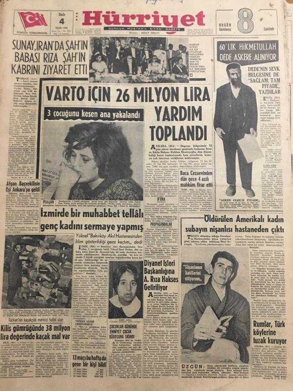 HÜRRİYET GAZETESİ 4 EKİM 1966 YIL : 19 SAYI :6621--Sunay ,İran da Şah ın Babası Rıza Şah ın Kabrini Ziyaret Etti ----Varto için 26 Milyon Lira Yardım Toplandı --İzmir de bir muhabbet tellalı genç kadını sermaye yapmış ---Kilis gümrüğünde 38 milyon lira değerinde kaçak mal var ---Öldüren Amerikalı kadın subayın nişanlısı hastaneden çıktı ---Diyanet İşleri Başkanlığına A.Rıza Hakses Getiriliyor ---Rumlar ,Türk köylerine tuzak kuruyor ---Belediye dar cepheli arsalara uygun görürse ruhsat verecek---Büyük Reis yeni kurulan Lesoto ya hem kral hem muhalefet lideri ---A.ve Ümitli Milli Takımlarımız Dün Kampa Girdi ---Antrenör Spayiç :Ajax ı kupadan eleyebiliriz dedi ----Ajax dün geldi ---Japonya da büyük binalar içinde Balık tutmak için havuz açıldı ---24 saatlik yarışı kazanan oto yu satın aldı ---Bu da Milli Otomobil :Bir kişilik arabanın boyu 2 ,eni 1 metre ---Şemsi usta yemeği ısmarladıktan sonra hazırlayıp ateşe oturtuyor ---, SEDAT SİMAVİ tarafından kaleme alınmıştır. Kitap 1966 yılında [HÜRRİYET MATBAA] yayınlanmıştır. 8 sayfadır. HÜRRİYET GAZETESİ 4 EKİM 1966 YIL : 19 SAYI :6621--Sunay ,İran da Şah ın Babası Rıza Şah ın Kabrini Ziyaret Etti ----Varto için 26 Milyon Lira Yardım Toplandı --İzmir de bir muhabbet tellalı genç kadını sermaye yapmış ---Kilis gümrüğünde 38 milyon lira değerinde kaçak mal var ---Öldüren Amerikalı kadın subayın nişanlısı hastaneden çıktı ---Diyanet İşleri Başkanlığına A.Rıza Hakses Getiriliyor ---Rumlar ,Türk köylerine tuzak kuruyor ---Belediye dar cepheli arsalara uygun görürse ruhsat verecek---Büyük Reis yeni kurulan Lesoto ya hem kral hem muhalefet lideri ---A.ve Ümitli Milli Takımlarımız Dün Kampa Girdi ---Antrenör Spayiç :Ajax ı kupadan eleyebiliriz dedi ----Ajax dün geldi ---Japonya da büyük binalar içinde Balık tutmak için havuz açıldı ---24 saatlik yarışı kazanan oto yu satın aldı ---Bu da Milli Otomobil :Bir kişilik arabanın boyu 2 ,eni 1 metre ---Şemsi usta yemeği ısmarladıktan sonra hazırlayıp ateşe oturtuyor --- adlı eser Türkçe dilindedir.