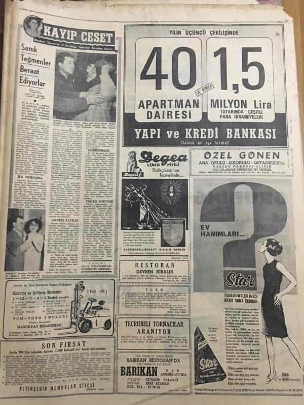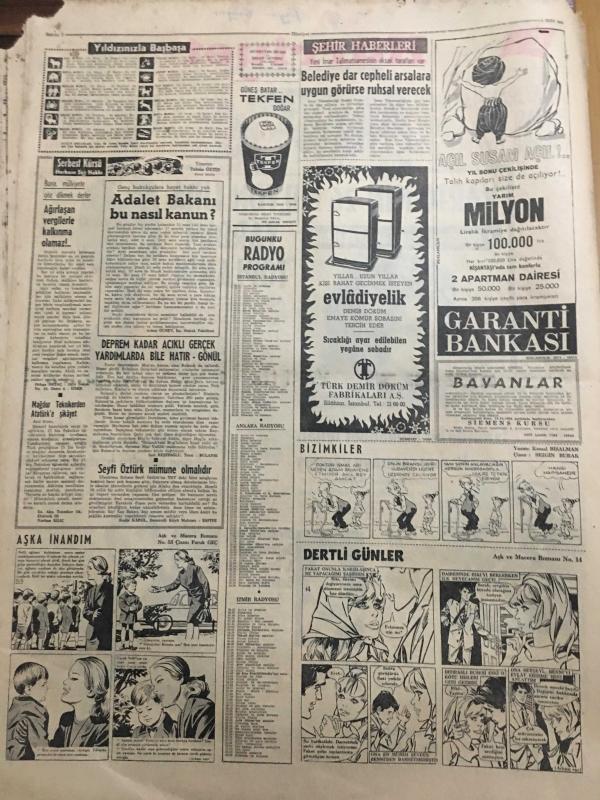 HÜRRİYET GAZETESİ 4 EKİM 1966 YIL : 19 SAYI :6621--Sunay ,İran da Şah ın Babası Rıza Şah ın Kabrini Ziyaret Etti ----Varto için 26 Milyon Lira Yardım Toplandı --İzmir de bir muhabbet tellalı genç kadını sermaye yapmış ---Kilis gümrüğünde 38 milyon lira değerinde kaçak mal var ---Öldüren Amerikalı kadın subayın nişanlısı hastaneden çıktı ---Diyanet İşleri Başkanlığına A.Rıza Hakses Getiriliyor ---Rumlar ,Türk köylerine tuzak kuruyor ---Belediye dar cepheli arsalara uygun görürse ruhsat verecek---Büyük Reis yeni kurulan Lesoto ya hem kral hem muhalefet lideri ---A.ve Ümitli Milli Takımlarımız Dün Kampa Girdi ---Antrenör Spayiç :Ajax ı kupadan eleyebiliriz dedi ----Ajax dün geldi ---Japonya da büyük binalar içinde Balık tutmak için havuz açıldı ---24 saatlik yarışı kazanan oto yu satın aldı ---Bu da Milli Otomobil :Bir kişilik arabanın boyu 2 ,eni 1 metre ---Şemsi usta yemeği ısmarladıktan sonra hazırlayıp ateşe oturtuyor --- adlı eser, Kitap > Süreli Yayınlar > Gazeteler > Türkiye > Genel > Günlük kategorisinde İkinci El olarak satıştadır.
