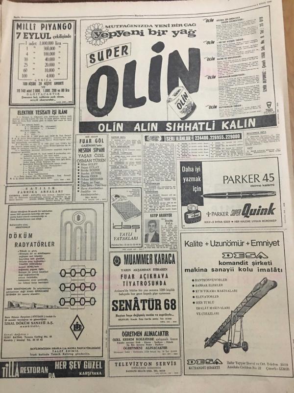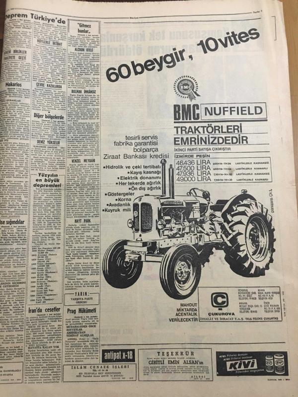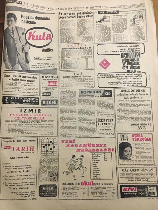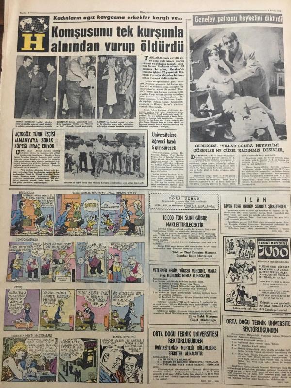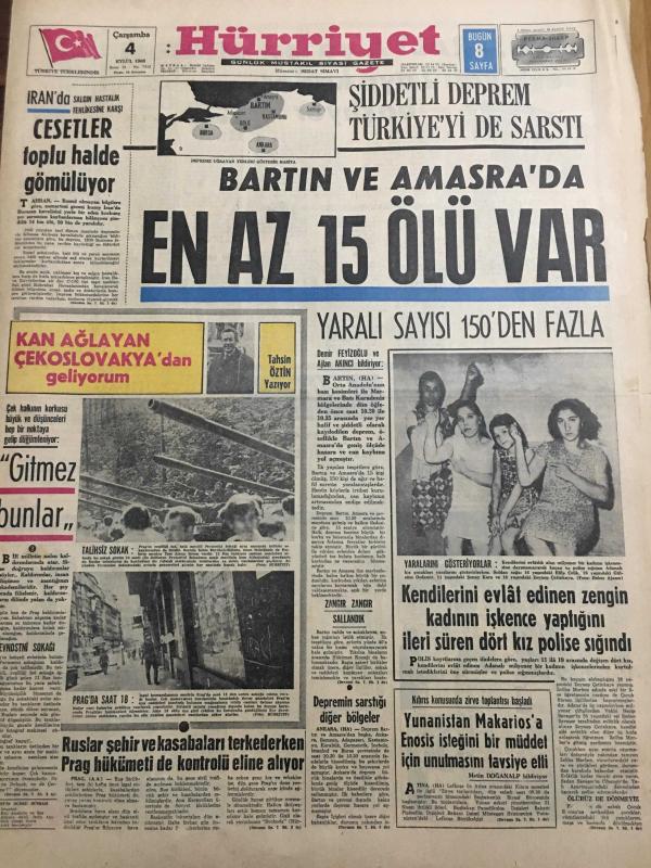 HÜRRİYET GAZETESİ 4 EYLÜL 1968 YIL :21 SAYI :7312--Cesetler toplu halde gömülüyor ---Bartın ve Amasra da En Az 15 Ölü Var --Yaralı sayısı 150 den fazla --Ruslar şehir ve kasabaları terk ederken Prag hükümeti de kontrolü eline alıyor ---Depremin sarstığı diğer bölgeler --Kendilerini evlat edinen zengin kadının işkence yaptığını ileri süren dört kız polise sığındı --Yunanistan Makarios a Enosis isteğini bir müddet için unutmasını tavsiye etti ---Avusturalya ya işçi sevkiyatı 2 aya kadar başlıyor ---Beşiktaş Olimpiakos --Ümitlerimiz şampiyonanın en zayıf ekibi gösteriliyor ---Manchester City ölmedi uyuyor --Atletlerimiz Balkan Şampiyonasına Gitti --Fenerbahçe de fazla kilo almak yasak --Galatasaray gençleri bugün deneyecek ---Bir milyonere yaş gününde göbek dansözü hediye ettiler --Tunç Plak : Aysel Türkoğlu ---Komşusunu tek kurşunla alnından vurup öldürdü --Üniversitelere öğrenci kaydı 5 gün sürecek ---Genelev patronu heykelini diktirdi --, SEDAT SİMAVİ tarafından kaleme alınmıştır. Kitap 1968 yılında [HÜRRİYET MATBAA] yayınlanmıştır. 8 sayfadır. HÜRRİYET GAZETESİ 4 EYLÜL 1968 YIL :21 SAYI :7312--Cesetler toplu halde gömülüyor ---Bartın ve Amasra da En Az 15 Ölü Var --Yaralı sayısı 150 den fazla --Ruslar şehir ve kasabaları terk ederken Prag hükümeti de kontrolü eline alıyor ---Depremin sarstığı diğer bölgeler --Kendilerini evlat edinen zengin kadının işkence yaptığını ileri süren dört kız polise sığındı --Yunanistan Makarios a Enosis isteğini bir müddet için unutmasını tavsiye etti ---Avusturalya ya işçi sevkiyatı 2 aya kadar başlıyor ---Beşiktaş Olimpiakos --Ümitlerimiz şampiyonanın en zayıf ekibi gösteriliyor ---Manchester City ölmedi uyuyor --Atletlerimiz Balkan Şampiyonasına Gitti --Fenerbahçe de fazla kilo almak yasak --Galatasaray gençleri bugün deneyecek ---Bir milyonere yaş gününde göbek dansözü hediye ettiler --Tunç Plak : Aysel Türkoğlu ---Komşusunu tek kurşunla alnından vurup öldürdü --Üniversitelere öğrenci kaydı 5 gün sürecek ---Genelev patronu heykelini diktirdi -- adlı eser Türkçe dilindedir.