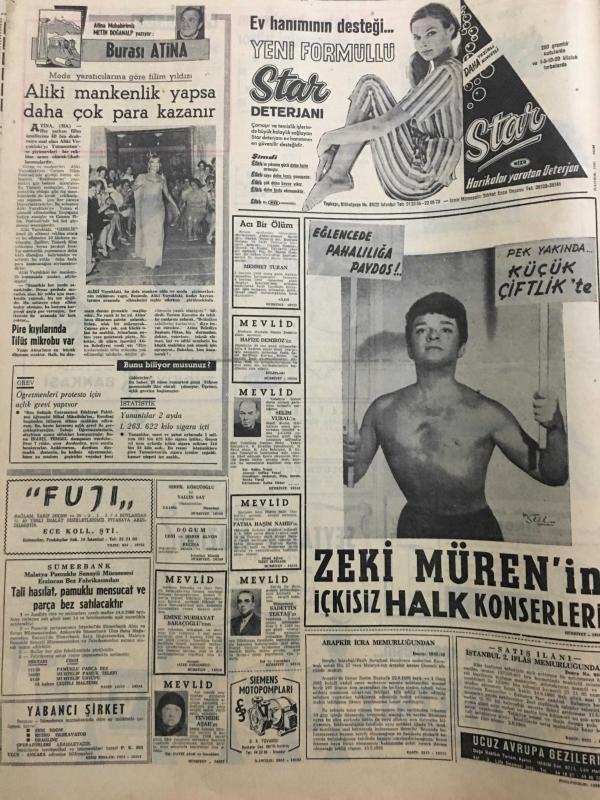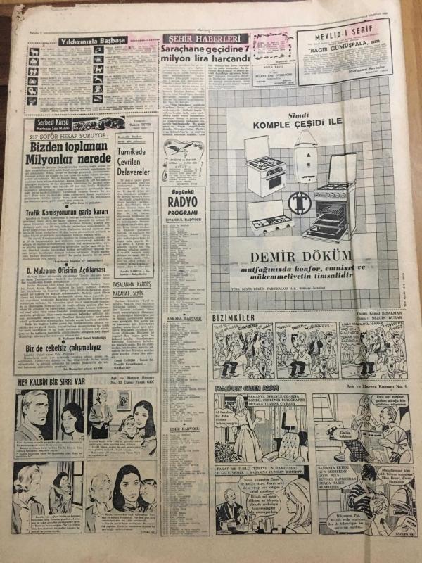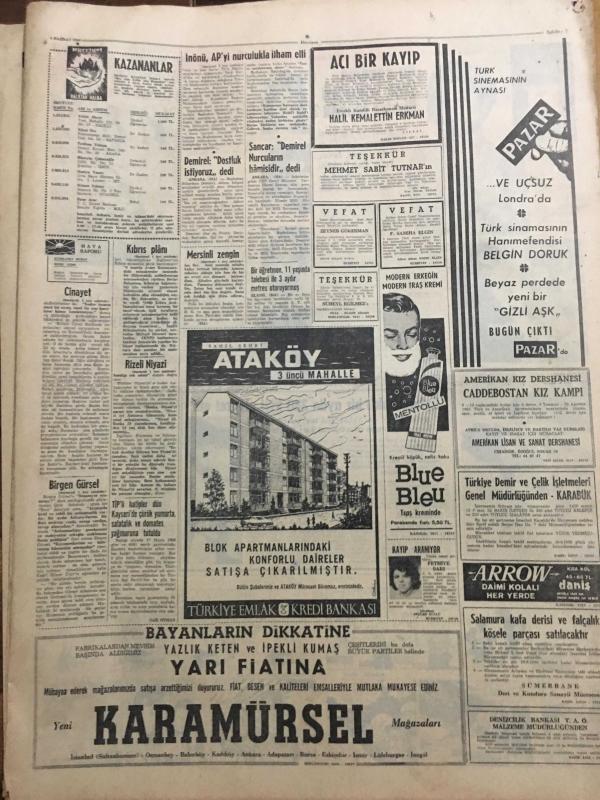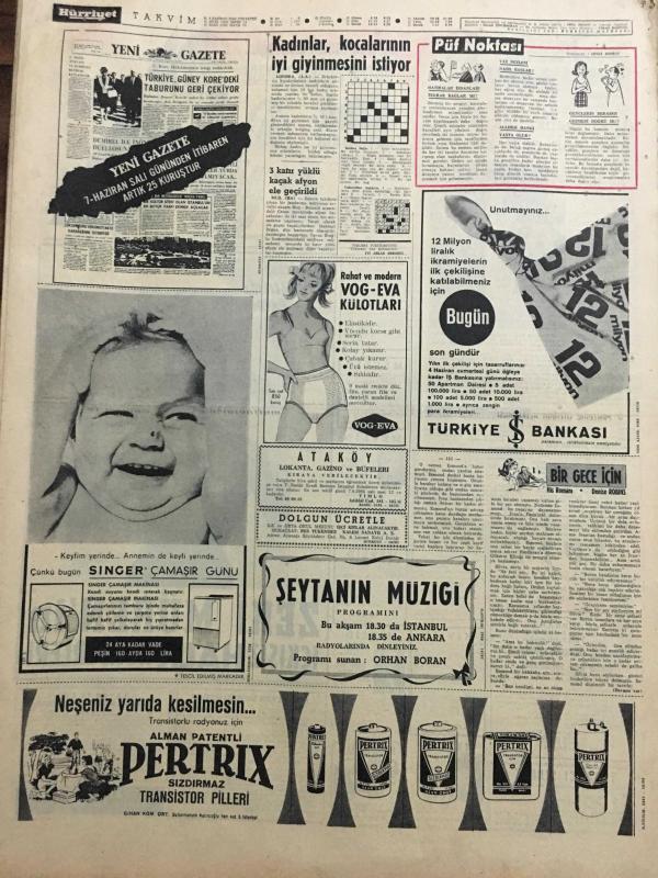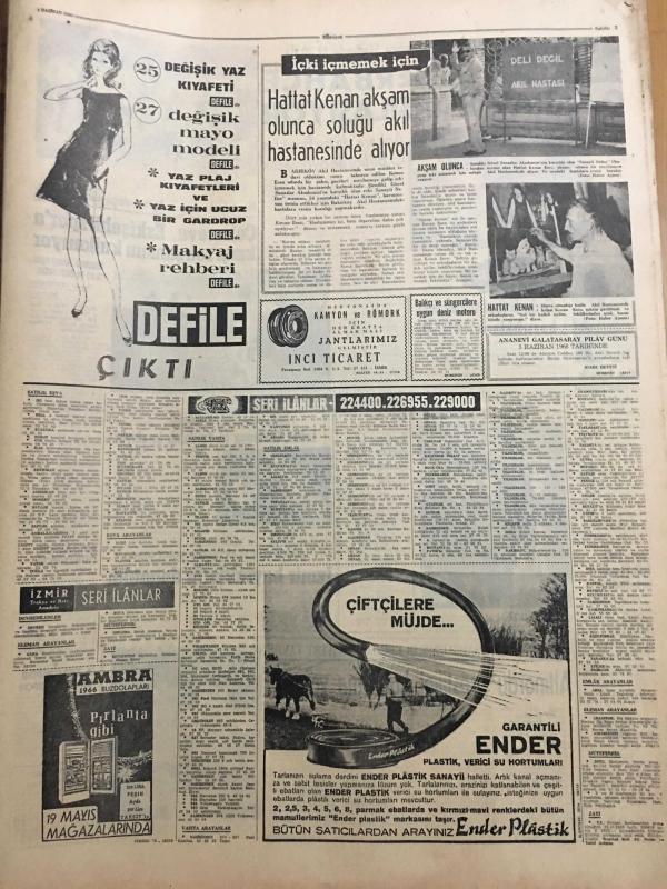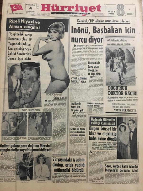 HÜRRİYET GAZETESİ 4 HAZİRAN 1966 YIL :19 SAYI :6499--Rizeli Niyazi ve Sevgilisi : Üç güzellik yarışı kazanmış olan 19 yaşındaki Alman kızı çoluk çocuk sahibi Karadenizli gence aşık oldu ---İnönü Başbakan için nurcu diyor --Giresun da çaya uçan otobüste 11 kişi öldü ---Önüne gelene para dağıtan Mersinli zengin otel de soyulduğunu iddia etti ---73 yaşındaki iş adamı okutup ,ortak yaptığı mühendisi öldürdü --Birgen Gürsel bir bluz ve eteklikte baba evine döndü ---Savcı kardeş katili idamlık Meryem in beratini istedi ---Saraçhane geçidine 7 milyon lira harcandı ---Kadınlar kocalarının iyi giyinmesini istiyor --Zeki Müren in içkisiz halk konserleri --Fenerbahçe Galatasaray karşılaşıyor --Ordu futbol takımımız hazırlıklarını bitirdi --Çukurova ,Eskişehirspor a karşı son şansını kullanıyor---Lefter ,Çukurova İd.Yurdu nu bırakıyor -- Ayhan Işık ı bir ayda 380 kişi ziyaret etti ---Bu senenin ümit yıldızları kimler olacak ? Golden Horn Türkiye ye döndü --- Yıpranma, sararmalar, kupon kesiği ve yırtılmalar zamana bağlı olarak görülebilir.