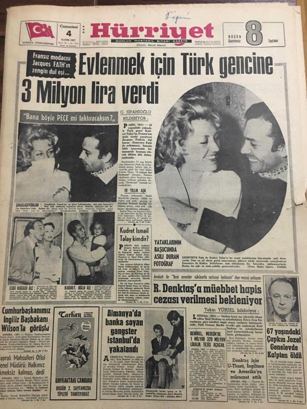 HÜRRİYET GAZETESİ 4 KASIM 1967 YIL :20 SAYI :7012---Evlenmek için Türk gencine 3 milyon lira verdi---Kudret İsmail Talay Kimdir ?--Cumhurbaşkanımız İngiliz Başbakanı Wilson la Görüştü --R.Denktaş a müebbet hapis cezası verilmesi bekleniyor ---Almanya da banka soyan gangster İstanbul da yakalandı ---67 Yaşında ki çapkın Jozef genelevde kalpten öldü ---Toprak Mahsülleri Ofisi Genel Müdür :Halkımız ekmeksiz kalmaz dedi --Rus ihtilalin ellinci yıldönümü kutlanıyor ---3 Büyükler Korku içinde --G.Birliği -Göztepe --Bir kolunu harpte diğerini maden ocağında kaybeden Rus hakem seyircilerin takdirini topluyor --İzmitlilerin yeni bir icadı : Prim toto ---2. Türkiye Liginden birer takımının düşmesi teklifi kabul edilmedi ---Bugün oynanacak ikinci ve üçüncü Türkiye ligi karşılaşmaları --Galatasaray Tuncer de Vefa --14 Yaşında ki İngiliz kızları doğumu kontrol hapı alıyor --Petrol Kralı 44 Yıl Sonra Şampiyonla Döğüştü --Demirel Mersin de 1 Milyar 329 Milyon Liralık Tesis Açacak ---, SEDAT SİMAVİ tarafından kaleme alınmıştır. Kitap 1967 yılında [HÜRRİYET MATBAA] yayınlanmıştır. 8 sayfadır. HÜRRİYET GAZETESİ 4 KASIM 1967 YIL :20 SAYI :7012---Evlenmek için Türk gencine 3 milyon lira verdi---Kudret İsmail Talay Kimdir ?--Cumhurbaşkanımız İngiliz Başbakanı Wilson la Görüştü --R.Denktaş a müebbet hapis cezası verilmesi bekleniyor ---Almanya da banka soyan gangster İstanbul da yakalandı ---67 Yaşında ki çapkın Jozef genelevde kalpten öldü ---Toprak Mahsülleri Ofisi Genel Müdür :Halkımız ekmeksiz kalmaz dedi --Rus ihtilalin ellinci yıldönümü kutlanıyor ---3 Büyükler Korku içinde --G.Birliği -Göztepe --Bir kolunu harpte diğerini maden ocağında kaybeden Rus hakem seyircilerin takdirini topluyor --İzmitlilerin yeni bir icadı : Prim toto ---2. Türkiye Liginden birer takımının düşmesi teklifi kabul edilmedi ---Bugün oynanacak ikinci ve üçüncü Türkiye ligi karşılaşmaları --Galatasaray Tuncer de Vefa --14 Yaşında ki İngiliz kızları doğumu kontrol hapı alıyor --Petrol Kralı 44 Yıl Sonra Şampiyonla Döğüştü --Demirel Mersin de 1 Milyar 329 Milyon Liralık Tesis Açacak --- adlı eser Türkçe dilindedir.