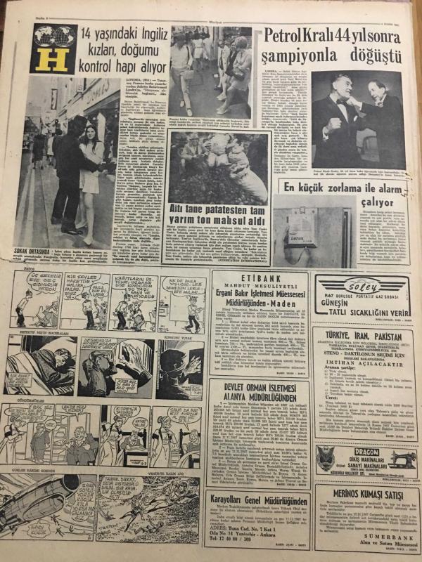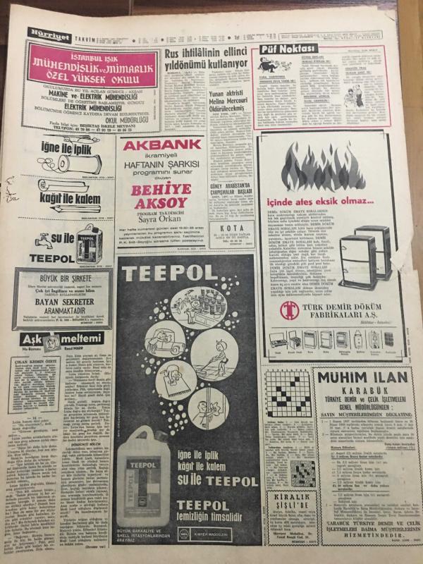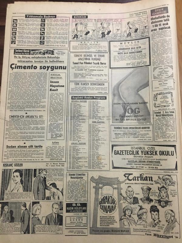 HÜRRİYET GAZETESİ 4 KASIM 1967 YIL :20 SAYI :7012---Evlenmek için Türk gencine 3 milyon lira verdi---Kudret İsmail Talay Kimdir ?--Cumhurbaşkanımız İngiliz Başbakanı Wilson la Görüştü --R.Denktaş a müebbet hapis cezası verilmesi bekleniyor ---Almanya da banka soyan gangster İstanbul da yakalandı ---67 Yaşında ki çapkın Jozef genelevde kalpten öldü ---Toprak Mahsülleri Ofisi Genel Müdür :Halkımız ekmeksiz kalmaz dedi --Rus ihtilalin ellinci yıldönümü kutlanıyor ---3 Büyükler Korku içinde --G.Birliği -Göztepe --Bir kolunu harpte diğerini maden ocağında kaybeden Rus hakem seyircilerin takdirini topluyor --İzmitlilerin yeni bir icadı : Prim toto ---2. Türkiye Liginden birer takımının düşmesi teklifi kabul edilmedi ---Bugün oynanacak ikinci ve üçüncü Türkiye ligi karşılaşmaları --Galatasaray Tuncer de Vefa --14 Yaşında ki İngiliz kızları doğumu kontrol hapı alıyor --Petrol Kralı 44 Yıl Sonra Şampiyonla Döğüştü --Demirel Mersin de 1 Milyar 329 Milyon Liralık Tesis Açacak --- Yıpranma, sararmalar, kupon kesiği ve yırtılmalar zamana bağlı olarak görülebilir.
