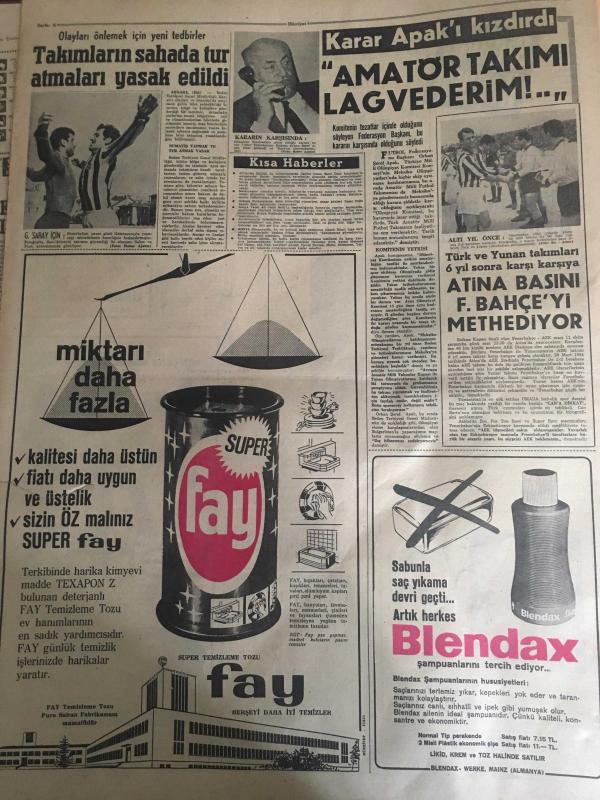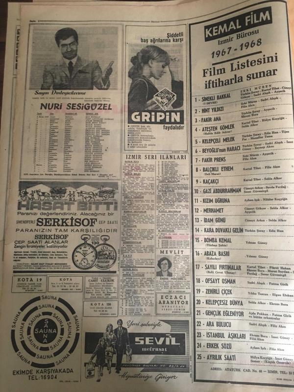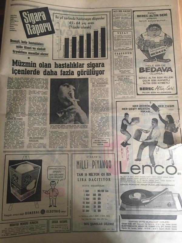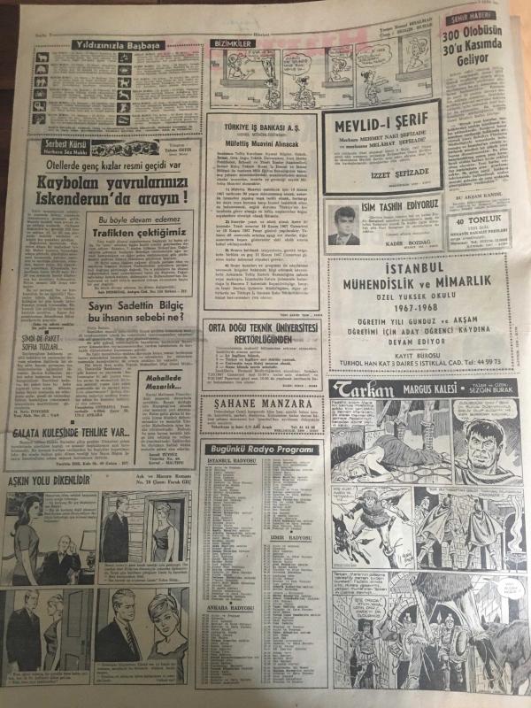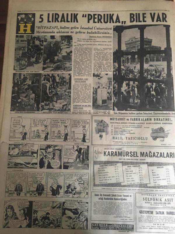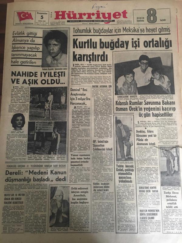 HÜRRİYET GAZETESİ 5 EKİM 1967 YIL :20 SAYI :6982--Evlatlık gittiği Almanya da işkence yapılıp tanınmayacak hale getirilen Nahide iyileşti ve aşık oldu --Kurtlu buğday işi ortalığı karıştırdı ---Dereli :Medeni Kanun düşmanlığı başladı dedi --Kıbrıslı Rumlar Savunma Bakanı Osman Örek in yeğenini kaçırıp üç gün hapsettiler --Demirel ' İlmi Araştırmalar için 3 Milyar Lira Harcanacak --Tahta bacak Erdal ,çaldığı otomobille gezerken yakalandı --İki homoseksüel İngiliz İtalya da uygunsuz vaziyette yakalandı ---Nuri Sesigüzel --Kemal Film :1967-1968 Film Listesini İftarla Sunar ---Takımların saha da tur atmaları yasak edildi --Amatör takımı Lağvederim ---Atina Basını Fenerbahçe yi Methediyor ---5 Liralık Peruka Bile Var --Yunan cuntasına kafa tutan kadın gazeteci evinde hapsedildi --Denktaş ,Kıbrıs Davasının Yeni Bir Planla Ele Alınmasını İstedi ---Evlat edinmek isteyen zengin Amerikalı kız seçimine bugün başlıyor --- Yıpranma, sararmalar, kupon kesiği ve yırtılmalar zamana bağlı olarak görülebilir.