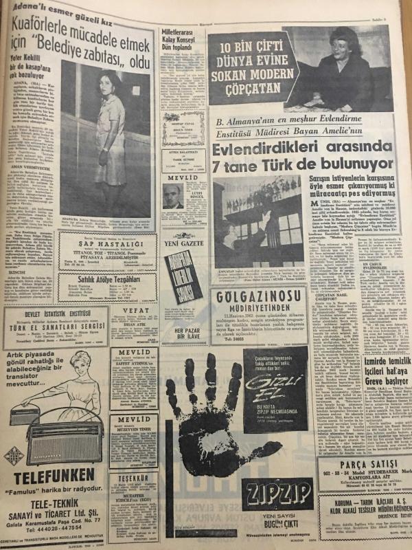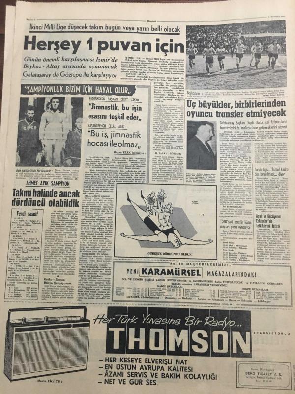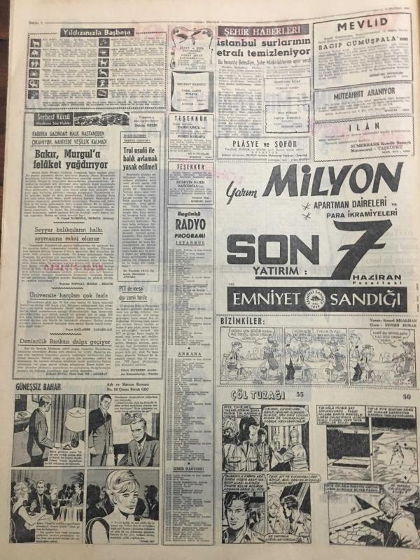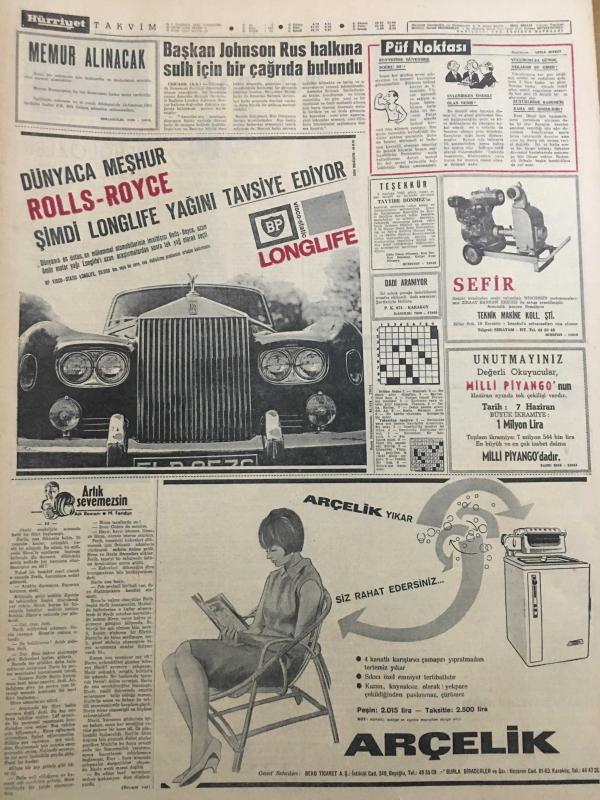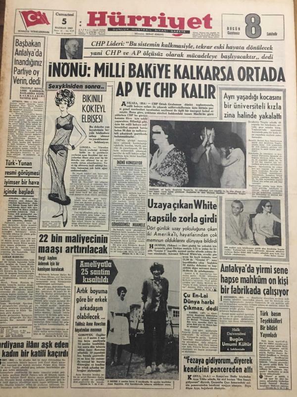 HÜRRİYET GAZETESİ 5 HAZİRAN 1965 YIL :18 SAYI :6140--Başbakan Antalya da İnandığınız Partiye Oy Verin Dedi ---İnönü :Milli Bakiye Kalkarsa Ortada AP ve CHP Kalır ---Türk -Yunan resmi görüşmesi iyimser bir hava içinde başladı --Uzaya çıkan White kapsüle zorla girdi ---22 bin maliyecinin maaşı arttırılacak ---Gardiyana ilanı aşk eden üç kadın bir katili kaçırdı ---Ameliyatla 25 santim kısaldı ---Antakya da yirmi sene hapse mahkum on kişi bir fabrikada çalışıyor ----Fezaya gidiyorum diyerek kendisini pencereden attı ---Başkan Johnson Rus Halkına sulh için bir çağrıda bulundu ---Her şey 1 puan için ---Takım halinde ancak dördüncü olabildik ---Üç büyükler ,birbirinden oyuncu transfer etmeyecek --Nebahat Çehre ,Miami de ki dünya güzellik kraliçesi için iddialı ---Vah ! zavallı Ayhan Işık Yaralanmış --Beşinci bir yıldız aranıyor --Fezaya gidiyorum diyerek kendisini pencereden attı ---Ayrı yaşadığı kocasını bir üniversiteli kızla zina halinde yakaladı --- Yıpranma, sararmalar, kupon kesiği ve yırtılmalar zamana bağlı olarak görülebilir.