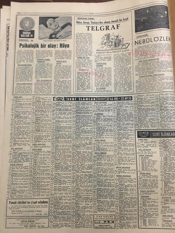HÜRRİYET GAZETESİ 5 HAZİRAN 1965 YIL :18 SAYI :6140--Başbakan Antalya da İnandığınız Partiye Oy Verin Dedi ---İnönü :Milli Bakiye Kalkarsa Ortada AP ve CHP Kalır ---Türk -Yunan resmi görüşmesi iyimser bir hava içinde başladı --Uzaya çıkan White kapsüle zorla girdi ---22 bin maliyecinin maaşı arttırılacak ---Gardiyana ilanı aşk eden üç kadın bir katili kaçırdı ---Ameliyatla 25 santim kısaldı ---Antakya da yirmi sene hapse mahkum on kişi bir fabrikada çalışıyor ----Fezaya gidiyorum diyerek kendisini pencereden attı ---Başkan Johnson Rus Halkına sulh için bir çağrıda bulundu ---Her şey 1 puan için ---Takım halinde ancak dördüncü olabildik ---Üç büyükler ,birbirinden oyuncu transfer etmeyecek --Nebahat Çehre ,Miami de ki dünya güzellik kraliçesi için iddialı ---Vah ! zavallı Ayhan Işık Yaralanmış --Beşinci bir yıldız aranıyor --Fezaya gidiyorum diyerek kendisini pencereden attı ---Ayrı yaşadığı kocasını bir üniversiteli kızla zina halinde yakaladı ---, SEDAT SİMAVİ tarafından kaleme alınmıştır. Kitap 1965 yılında [HÜRRİYET MATBAA] yayınlanmıştır. 8 sayfadır. HÜRRİYET GAZETESİ 5 HAZİRAN 1965 YIL :18 SAYI :6140--Başbakan Antalya da İnandığınız Partiye Oy Verin Dedi ---İnönü :Milli Bakiye Kalkarsa Ortada AP ve CHP Kalır ---Türk -Yunan resmi görüşmesi iyimser bir hava içinde başladı --Uzaya çıkan White kapsüle zorla girdi ---22 bin maliyecinin maaşı arttırılacak ---Gardiyana ilanı aşk eden üç kadın bir katili kaçırdı ---Ameliyatla 25 santim kısaldı ---Antakya da yirmi sene hapse mahkum on kişi bir fabrikada çalışıyor ----Fezaya gidiyorum diyerek kendisini pencereden attı ---Başkan Johnson Rus Halkına sulh için bir çağrıda bulundu ---Her şey 1 puan için ---Takım halinde ancak dördüncü olabildik ---Üç büyükler ,birbirinden oyuncu transfer etmeyecek --Nebahat Çehre ,Miami de ki dünya güzellik kraliçesi için iddialı ---Vah ! zavallı Ayhan Işık Yaralanmış --Beşinci bir yıldız aranıyor --Fezaya gidiyorum diyerek kendisini pencereden attı ---Ayrı yaşadığı kocasını bir üniversiteli kızla zina halinde yakaladı --- adlı eser Türkçe dilindedir.