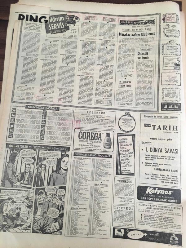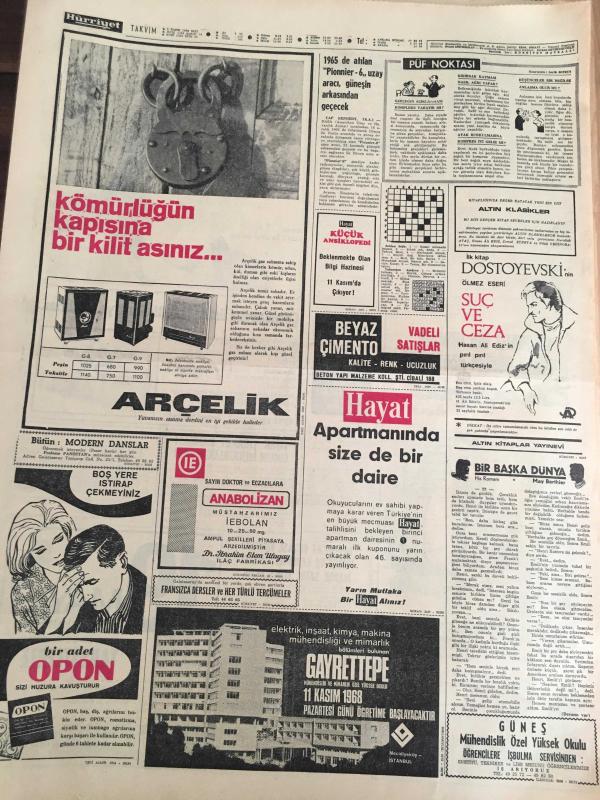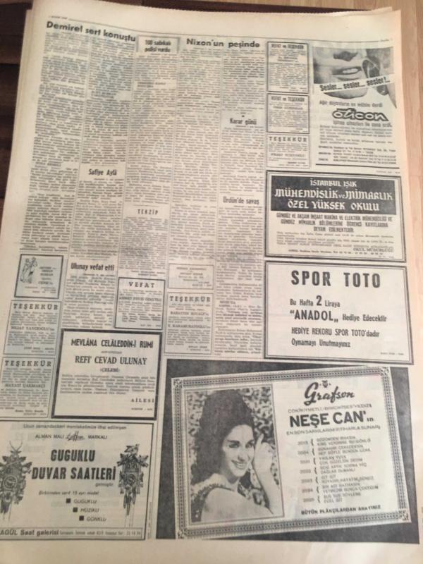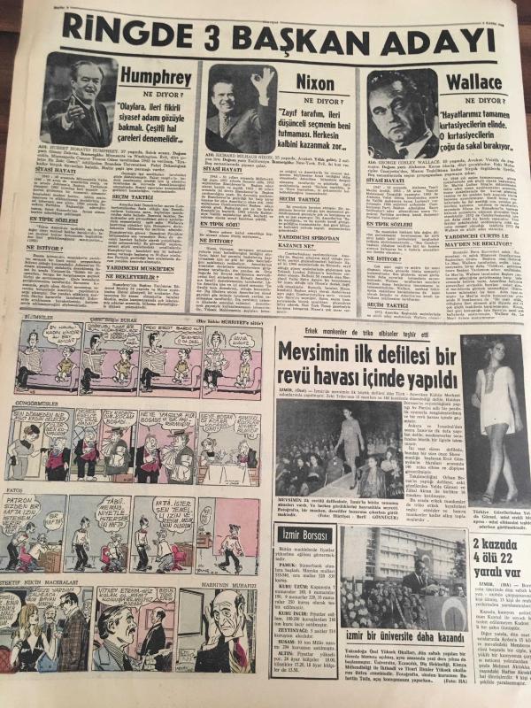 HÜRRİYET GAZETESİ 5 KASIM 1968 YIL :21 SAYI :7374----Yeni bir başkan seçiliyor :Amerika da karar günü --Demirel :Türk siyasi hayatını çıkmaza sokmak istiyorlar --Ürdün de sokak savaşı başladı --100 sabıkalı insan azmanı , iki kilo rakıyı içtikten sonra polisi vurdu --- Refi Cevat Ulunay vefat Etti ---Ilgaz : Moral çöküntüsü içindeyiz , futbolculara ceza yok --Ajax - Fenerbahçe maçını 20 bin Türk İşçisi izleyecek -----Ring de 3 başkan adayı : Humphrey , Nixon , Wallece ---Mevsimin ilk defilesi bir revü havası içinde yapıldı ---İzmir bir üniversite daha kazandı----- Yıpranma, sararmalar, kupon kesiği ve yırtılmalar zamana bağlı olarak görülebilir.
