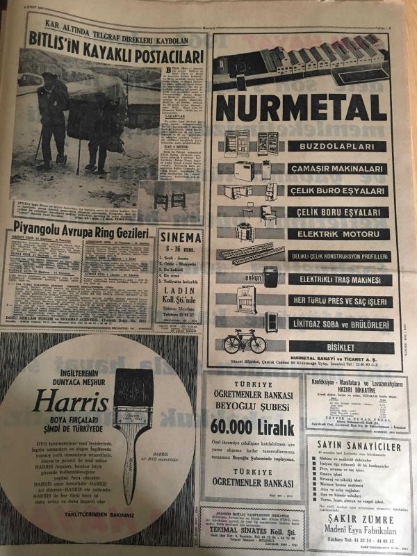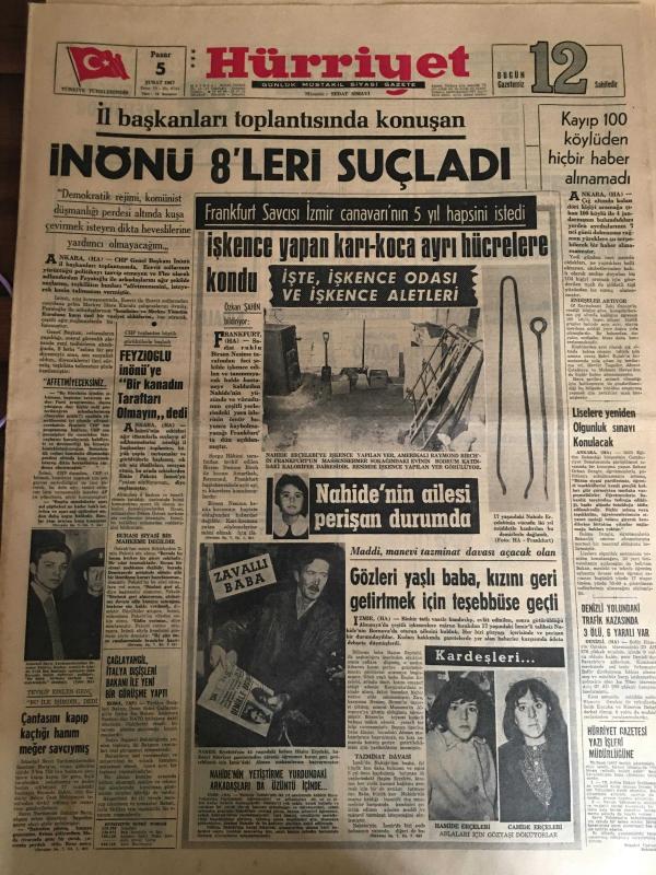 HÜRRİYET GAZETESİ 5 ŞUBAT 1967 YIL :19 SAYI :6743---İnönü 8 leri suçladı --İşkence yapan karı -koca ayrı hücrelere kondu ---Feyzioğlu İnönü ye bir kanadın taraftarı olmayın dedi ---Nahide nin ailesi perişan durumda : Nahide nin yetiştirme yurdundaki arkadaşları da üzüntü içinde --Kayıp 100 köylüden hiç bir haber alınamadı --Çantasını kapıp kaçtığı hanım meğer savcıymış ---Gözleri yaşlı baba ,kızını geri getirmek için teşebbüse geçti --Denizli yolunda ki trafik kazasında 3 ölü ,6 yaralı var ---Parklar ve tarihi eserler fenerlerle ışıklandırılacak ---Amerika da Mürettebatlı Uzay Uçuşları Bir Yıl Ertelendi --Bitlis in kayaklı postacıları --Fenerbahçe -Göztepe --G.Birliği :1 Demirspor :1 --Vefa gol yağdırdı :5-0--Ank.Gücü :2 H.Tepe :1---Karşıyaka :1 Feriköy :0--Beşiktaş -Altınordu --PTT -Galatasaray -- Yıpranma, sararmalar, kupon kesiği ve yırtılmalar zamana bağlı olarak görülebilir.