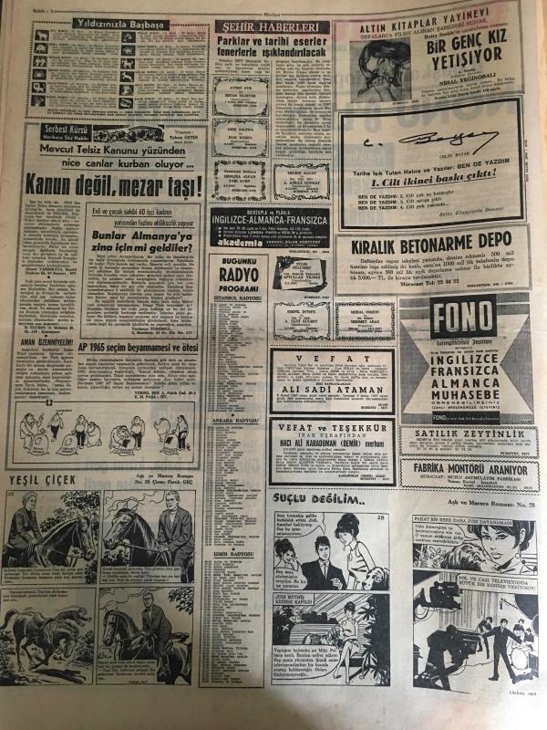 HÜRRİYET GAZETESİ 5 ŞUBAT 1967 YIL :19 SAYI :6743---İnönü 8 leri suçladı --İşkence yapan karı -koca ayrı hücrelere kondu ---Feyzioğlu İnönü ye bir kanadın taraftarı olmayın dedi ---Nahide nin ailesi perişan durumda : Nahide nin yetiştirme yurdundaki arkadaşları da üzüntü içinde --Kayıp 100 köylüden hiç bir haber alınamadı --Çantasını kapıp kaçtığı hanım meğer savcıymış ---Gözleri yaşlı baba ,kızını geri getirmek için teşebbüse geçti --Denizli yolunda ki trafik kazasında 3 ölü ,6 yaralı var ---Parklar ve tarihi eserler fenerlerle ışıklandırılacak ---Amerika da Mürettebatlı Uzay Uçuşları Bir Yıl Ertelendi --Bitlis in kayaklı postacıları --Fenerbahçe -Göztepe --G.Birliği :1 Demirspor :1 --Vefa gol yağdırdı :5-0--Ank.Gücü :2 H.Tepe :1---Karşıyaka :1 Feriköy :0--Beşiktaş -Altınordu --PTT -Galatasaray --, SEDAT SİMAVİ tarafından kaleme alınmıştır. Kitap 1967 yılında [HÜRRİYET MATBAA] yayınlanmıştır. 12 sayfadır. HÜRRİYET GAZETESİ 5 ŞUBAT 1967 YIL :19 SAYI :6743---İnönü 8 leri suçladı --İşkence yapan karı -koca ayrı hücrelere kondu ---Feyzioğlu İnönü ye bir kanadın taraftarı olmayın dedi ---Nahide nin ailesi perişan durumda : Nahide nin yetiştirme yurdundaki arkadaşları da üzüntü içinde --Kayıp 100 köylüden hiç bir haber alınamadı --Çantasını kapıp kaçtığı hanım meğer savcıymış ---Gözleri yaşlı baba ,kızını geri getirmek için teşebbüse geçti --Denizli yolunda ki trafik kazasında 3 ölü ,6 yaralı var ---Parklar ve tarihi eserler fenerlerle ışıklandırılacak ---Amerika da Mürettebatlı Uzay Uçuşları Bir Yıl Ertelendi --Bitlis in kayaklı postacıları --Fenerbahçe -Göztepe --G.Birliği :1 Demirspor :1 --Vefa gol yağdırdı :5-0--Ank.Gücü :2 H.Tepe :1---Karşıyaka :1 Feriköy :0--Beşiktaş -Altınordu --PTT -Galatasaray -- adlı eser Türkçe dilindedir.