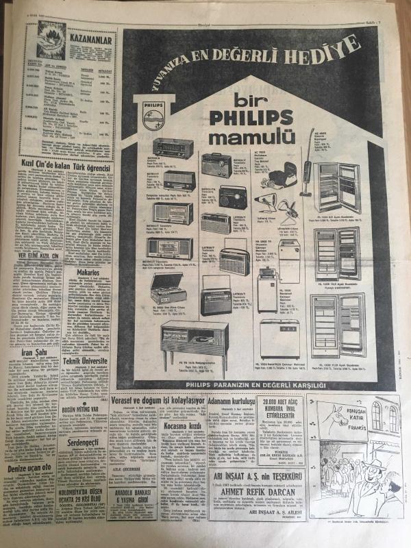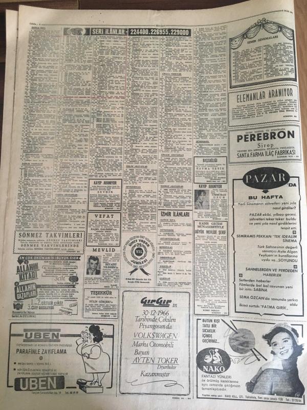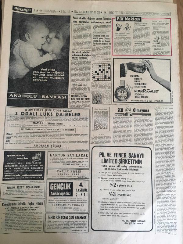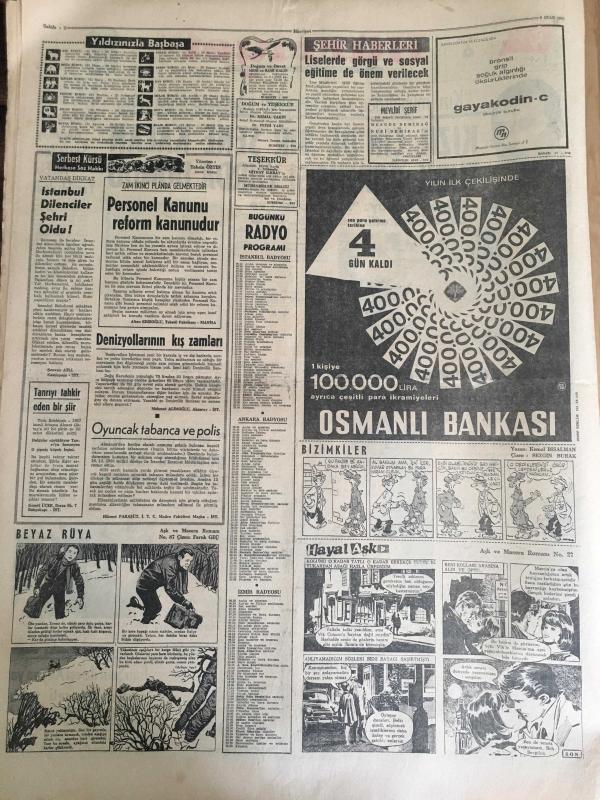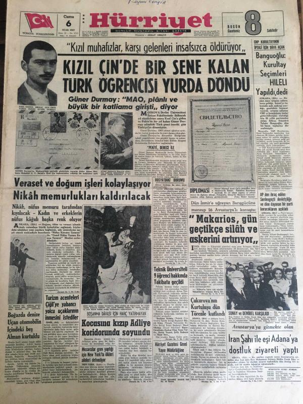 HÜRRİYET GAZETESİ 6 OCAK 1967 YIL :19 SAYI :6715---Kızıl Muhafızlar ,karşı gelenleri insafsızca öldürülüyor ---Kızıl Çin de sene kalan Türk öğrenci yurda döndü ---Veraset ve doğum işleri kolaylaşıyor Nikah memurları kaldırılacak ---Makarios gün geçtikçe silah ve askerini artırıyor ---Turizm acenteleri Çiğli ye yabancı yolcu uçaklarının inmesini istediler ---Kocasına kızıp adliye koridorunda soyundu ---Banguoğlu Kurultay Seçimleri Hileli Yapıldı Dedi ---Çukurova nın Kurtuluşu Dün Törenle Kutlandı --İran Şahı ile eşi Adana ya dostluk ziyareti yapıldı ---Liselerde görgü ve sosyal eğitime de önem verilecek ---Galatasaray 'ın hedefi haftayı 4 puanla kapatmak ---Namık Seyhan Hayatını Hamallıkla Kazanıyor --Antrenör Basri :Vefa 2. lige düşmeyecek ---Lemiç e para cezası verilecek ----Kızıl Çin de liderlerin karıları kapışıyorlar ---Jilet fabrikasında ki bir usta sakalımı kesmem diyor ---New York ta kar küreyenler saatte 22 lira kazanıyorlar ---- Yıpranma, sararmalar, kupon kesiği ve yırtılmalar zamana bağlı olarak görülebilir.