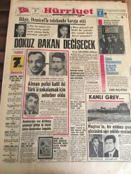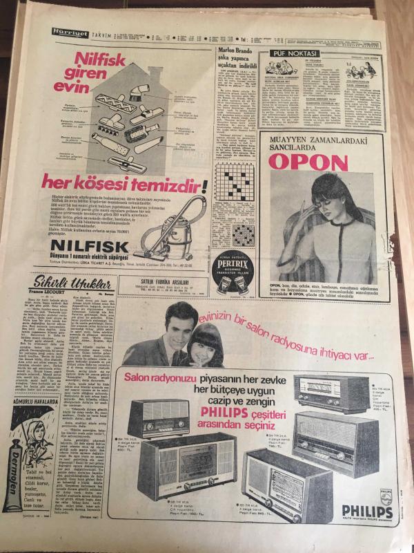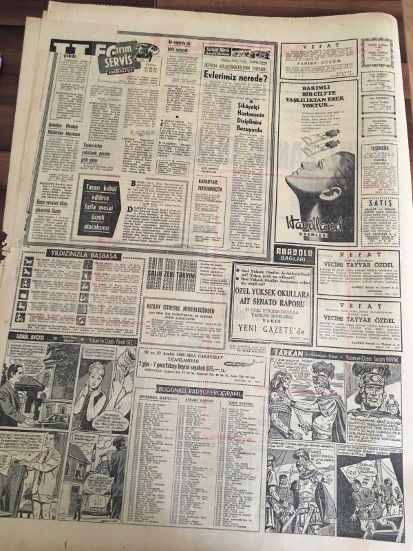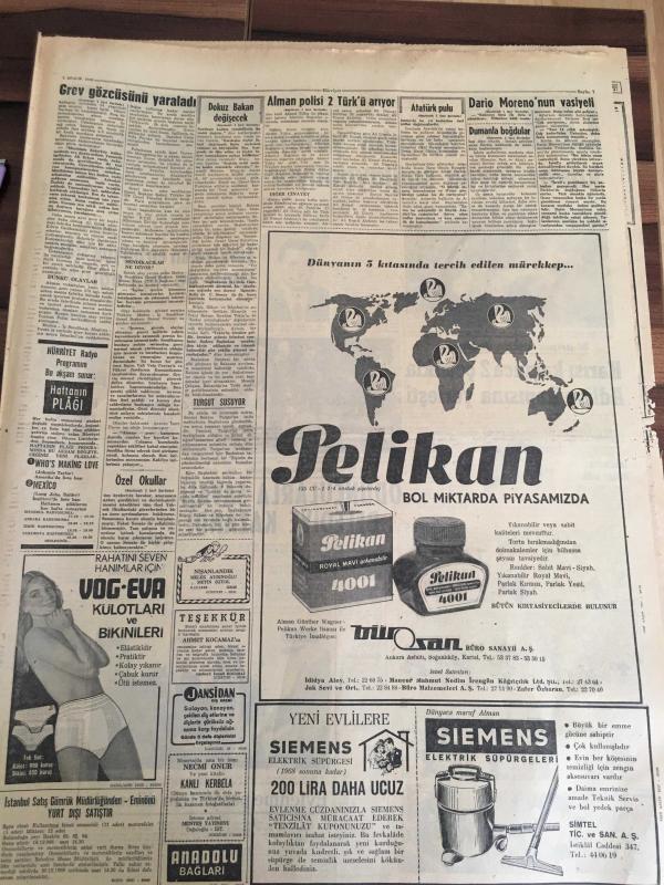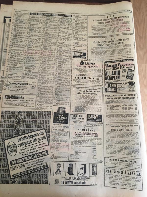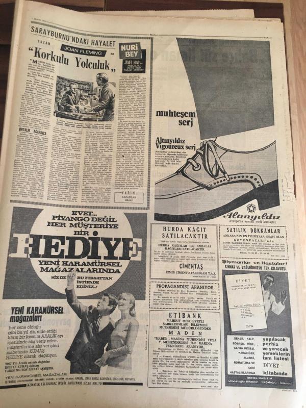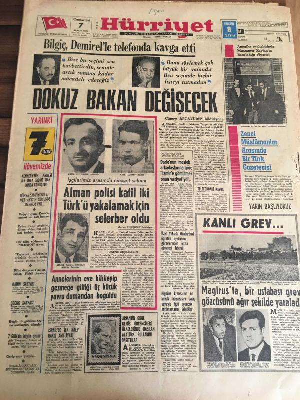 HÜRRİYET GAZETESİ 7 ARALIK 1968 YIL :21 SAYI :7406---Bilgiç ,Demirel le telefonda kavga etti --Dokuz Bakan Değişecek --Alman Polisi katil iki Türk 'ü yakalamak için seferber oldu --Magirus 'ta bir ustabaşı grev gözcüsünü ağır şekilde yaraladı ---Fenerbahçe süt liman oldu --İdealistlere göre , Fenerbahçe idare heyeti şaşkına döndü--- Eskişehir Adana ile Bursa İst .Spor la özel maç yapacak --Şenol ve Ergün üçüncü defa aynı forma altında bir araya geldiler --Beşiktaşlılar öfkelendi :Fenerbahçe 'ye cevabı sahada vereceğiz --Altaylı altı futbolcuyu pavyonda yakalandı ---Voleybol da Türkiye ligi kuruluyor --Ticaret Borsası Başkanı Hasan Güven gereken önemin verilmesi istedi :Borsalar yeteri kadar fayda sağlayamıyor --Türkiye nin en büyük stadı İzmir de inşa ediliyor -- Yıpranma, sararmalar, kupon kesiği ve yırtılmalar zamana bağlı olarak görülebilir.