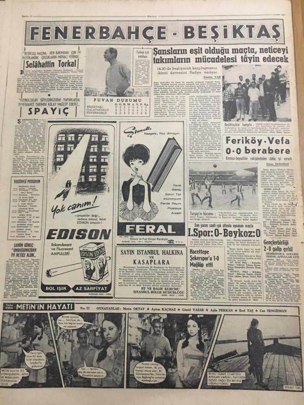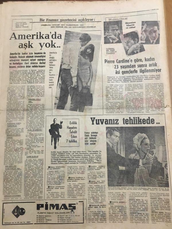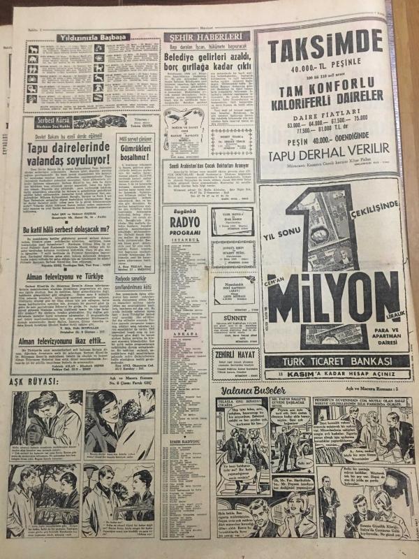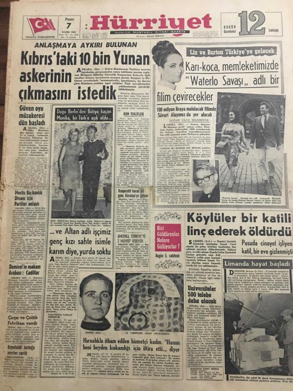 HÜRRİYET GAZETESİ 7 KASIM 1965 YIL :18 SAYI :6295--Kıbrıs ta ki 10 bin Yunan askerinin çıkmasını istedik --Güven oyu müzakeresi dün başladı --Ve Altan adlı işçimiz genç kızı sahte isimle karım diye yurda soktu --Karı-koca memleketimizde Waterlo Savaşı adlı bir film çevirecekler ---Köylüler bir katili linç ederek öldürdü --Çırçır ve çeltik fabrikası yandı --Demirel in makam arabası : Cadillac---Belediye gelirleri azaldı ,borç gırtlağa kadar çıktı ---Romalı gençler ,serseri turistlere dayak attılar ---Fenerbahçe -Beşiktaş --Şansların eşit olduğu maçta ,neticeyi takımların mücadelesi tayin edecek --Feriköy -Vefa 0-0 berabere ---I. Spor :0 Beykoz :0--Hacettepe Şekerspor u 1-0 mağlup etti ---Meclis Bakanlık Divanı için partiler anlaştı --Üniversiteler 500 talebe daha alacak --Hırsızlıkla itham edilen hizmetçi kadın hanım beyden kıskandığı için iftira etti diyor ---Amerika ,Türkiye ye 2 Muhrip Veriyor -- Yıpranma, sararmalar, kupon kesiği ve yırtılmalar zamana bağlı olarak görülebilir.