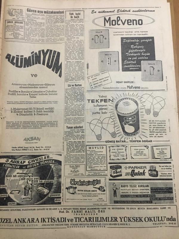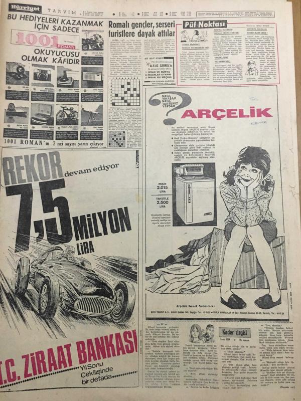 HÜRRİYET GAZETESİ 7 KASIM 1965 YIL :18 SAYI :6295--Kıbrıs ta ki 10 bin Yunan askerinin çıkmasını istedik --Güven oyu müzakeresi dün başladı --Ve Altan adlı işçimiz genç kızı sahte isimle karım diye yurda soktu --Karı-koca memleketimizde Waterlo Savaşı adlı bir film çevirecekler ---Köylüler bir katili linç ederek öldürdü --Çırçır ve çeltik fabrikası yandı --Demirel in makam arabası : Cadillac---Belediye gelirleri azaldı ,borç gırtlağa kadar çıktı ---Romalı gençler ,serseri turistlere dayak attılar ---Fenerbahçe -Beşiktaş --Şansların eşit olduğu maçta ,neticeyi takımların mücadelesi tayin edecek --Feriköy -Vefa 0-0 berabere ---I. Spor :0 Beykoz :0--Hacettepe Şekerspor u 1-0 mağlup etti ---Meclis Bakanlık Divanı için partiler anlaştı --Üniversiteler 500 talebe daha alacak --Hırsızlıkla itham edilen hizmetçi kadın hanım beyden kıskandığı için iftira etti diyor ---Amerika ,Türkiye ye 2 Muhrip Veriyor --, SEDAT SİMAVİ tarafından kaleme alınmıştır. Kitap 1965 yılında [HÜRRİYET MATBAA] yayınlanmıştır. 12 sayfadır. HÜRRİYET GAZETESİ 7 KASIM 1965 YIL :18 SAYI :6295--Kıbrıs ta ki 10 bin Yunan askerinin çıkmasını istedik --Güven oyu müzakeresi dün başladı --Ve Altan adlı işçimiz genç kızı sahte isimle karım diye yurda soktu --Karı-koca memleketimizde Waterlo Savaşı adlı bir film çevirecekler ---Köylüler bir katili linç ederek öldürdü --Çırçır ve çeltik fabrikası yandı --Demirel in makam arabası : Cadillac---Belediye gelirleri azaldı ,borç gırtlağa kadar çıktı ---Romalı gençler ,serseri turistlere dayak attılar ---Fenerbahçe -Beşiktaş --Şansların eşit olduğu maçta ,neticeyi takımların mücadelesi tayin edecek --Feriköy -Vefa 0-0 berabere ---I. Spor :0 Beykoz :0--Hacettepe Şekerspor u 1-0 mağlup etti ---Meclis Bakanlık Divanı için partiler anlaştı --Üniversiteler 500 talebe daha alacak --Hırsızlıkla itham edilen hizmetçi kadın hanım beyden kıskandığı için iftira etti diyor ---Amerika ,Türkiye ye 2 Muhrip Veriyor -- adlı eser Türkçe dilindedir.