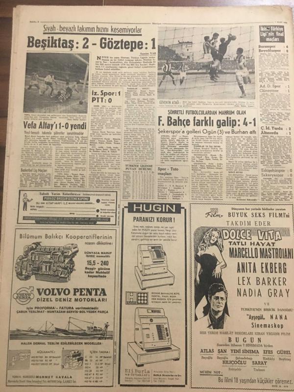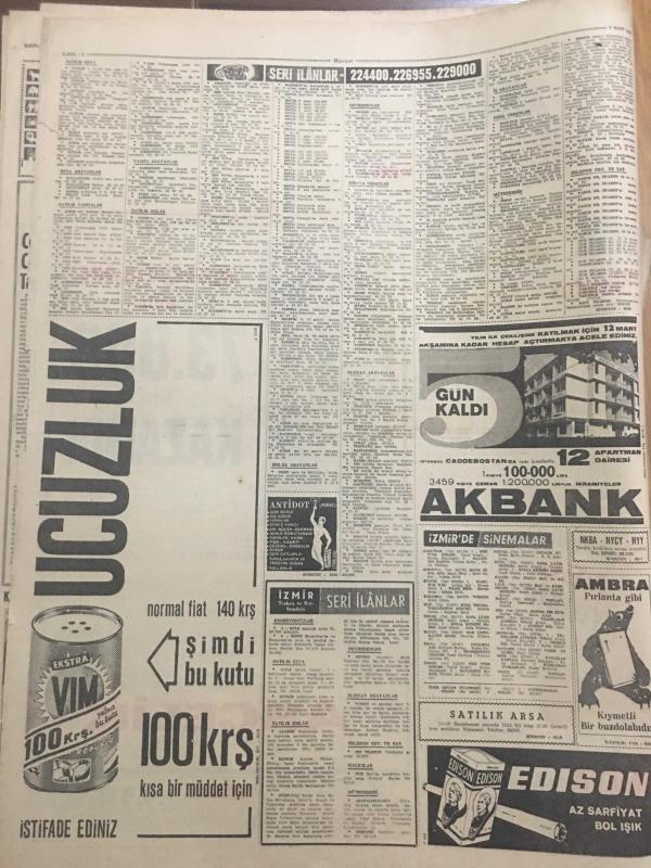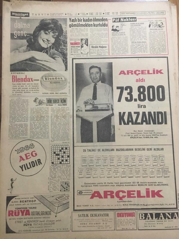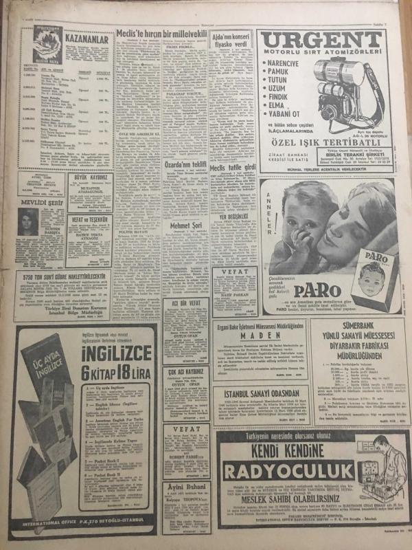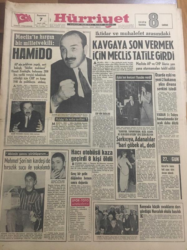 HÜRRİYET GAZETESİ 7 MART 1966 YIL :18 SAYI :6413---Meclis te hırçın bir milletvekili :Hamido ---Kavgaya son vermek için meclis tatile girdi ---Mehmet Şori nin kardeşi de hırsızlık suçu ile yakalandı --Hacı otobüsü kaza geçirdi 8 kişi öldü ---Özarda eski ve yeni 2 bakanın yüce divana sevkini istedi --Şarkıcıya ,Adanalılar bari göbek attı ----Konya da küçük çocukların ders gördüğü Nurculuk okulu basıldı ---İstanbul da bir Kızılay Hastanesi inşa edilecek ---Yaşlı bir kadın ölmeden gömülmekten kurtuldu ---İstanbul un en rahat ve modern sineması hizmete girdi ---Beşiktaş :2 Göztepe :1 ---Vefa Altay ı 1-0 yendi ---Fenerbahçe farklı galip :4-1----3 İngiliz kızı para kazanmanın yolunu Van kedilerin de buldu ---Avusturalya da şalvar modası ---Doktorlar :Bu çocuk bir felaket olacak diyor ---Genç bir gelin düğünden hemen sonra doğurdu ---Varan 3 :Tokyo havaalanında bir uçak daha düştü--- Yıpranma, sararmalar, kupon kesiği ve yırtılmalar zamana bağlı olarak görülebilir.