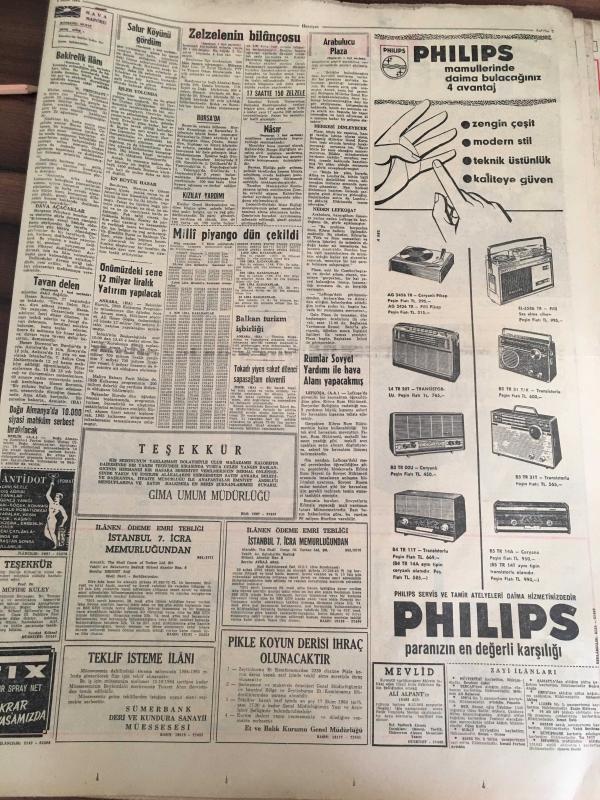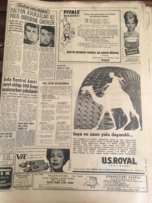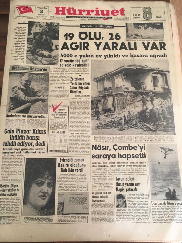 HÜRRİYET GAZETESİ 8 EKİM 1964 YIL :17 SAYI : 5915---19 Ölü ,26 ağır yaralı var --Galo Plaza :Kıbrıs ihtilafı barışı tehdit ediyor --Ağaoğlu , Dülger ve Kavrakoğlu da tahliye edildi -- Zelzelenin yerle bir ettiği Salur Köyünü gördüm -- Nasır ,Çombe 'yi saraya hapsetti --Belediye Encümeni seçimi ihtilafa sebebiyet verdi --Çiçekli 'nin katili :Pişman değilim dedi ----Ira , çocuklarıma doyamadım ,diyor --Gıda kontrol Amiri rüşvet aldığı 500 lirayı bozdururken yakalandı --Amsterdam da ki 3-1 lik maçın rövanşı dün gece oynandı :Fenerbahçe elendi ---Olimpiyat köyünde hırsızlar çoğaldı --Galatasaray Viyana da kura ile tur atladı -- Gündüz Kılıç B. Ahmet 'ten endişe ediyor --Zelzeleden fotoğraflar : Manyas Salur köyü bu hale geldi -- Yıpranma, sararmalar, kupon kesiği ve yırtılmalar zamana bağlı olarak görülebilir.