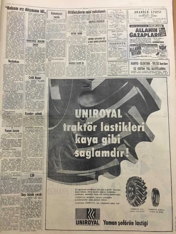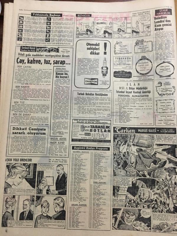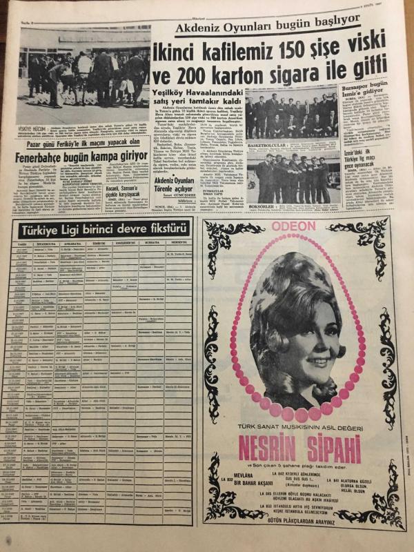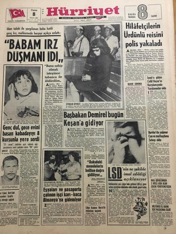 HÜRRİYET GAZETESİ 8 EYLÜL 1967 YIL :20 SAYI :6955----Babam ırz düşmanı idi --Hilafetçilerin Ürdünlü Reisini Polis Yakaladı ---Genç dul ,gece evini basan kabadayıyı 8 kurşunla yere serdi ---Başbakan Demirel Bugün Keşan a Gidiyor ---Eşyaları ve pasaportu çalınan işçi karı-koca Almanya ya gidemiyor ---Burdur da yağmur Can ve mal kaybına sebep oldu ----Ford fabrikasındaki işçiler greve başladı ---Sevim Şengül :Plaklarını iftarla Sunar ---İkinci kafilemiz 150 şişe viski ve 200 karton sigara ile gitti ---Fenerbahçe bugün kampa giriyor ---Sakat Çocuklar Okulu ---Libya Kralının Bursa da Tedavisine Başladı ---İzmir e giden Celal Bayar ın karşılanışında yaralananlar oldu --Milyoner İş Adamı İçki Masasında Öldü --- Yıpranma, sararmalar, kupon kesiği ve yırtılmalar zamana bağlı olarak görülebilir.