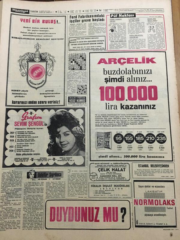HÜRRİYET GAZETESİ 8 EYLÜL 1967 YIL :20 SAYI :6955----Babam ırz düşmanı idi --Hilafetçilerin Ürdünlü Reisini Polis Yakaladı ---Genç dul ,gece evini basan kabadayıyı 8 kurşunla yere serdi ---Başbakan Demirel Bugün Keşan a Gidiyor ---Eşyaları ve pasaportu çalınan işçi karı-koca Almanya ya gidemiyor ---Burdur da yağmur Can ve mal kaybına sebep oldu ----Ford fabrikasındaki işçiler greve başladı ---Sevim Şengül :Plaklarını iftarla Sunar ---İkinci kafilemiz 150 şişe viski ve 200 karton sigara ile gitti ---Fenerbahçe bugün kampa giriyor ---Sakat Çocuklar Okulu ---Libya Kralının Bursa da Tedavisine Başladı ---İzmir e giden Celal Bayar ın karşılanışında yaralananlar oldu --Milyoner İş Adamı İçki Masasında Öldü ---, SEDAT SİMAVİ tarafından kaleme alınmıştır. Kitap 1967 yılında [HÜRRİYET MATBAA] yayınlanmıştır. 8 sayfadır. HÜRRİYET GAZETESİ 8 EYLÜL 1967 YIL :20 SAYI :6955----Babam ırz düşmanı idi --Hilafetçilerin Ürdünlü Reisini Polis Yakaladı ---Genç dul ,gece evini basan kabadayıyı 8 kurşunla yere serdi ---Başbakan Demirel Bugün Keşan a Gidiyor ---Eşyaları ve pasaportu çalınan işçi karı-koca Almanya ya gidemiyor ---Burdur da yağmur Can ve mal kaybına sebep oldu ----Ford fabrikasındaki işçiler greve başladı ---Sevim Şengül :Plaklarını iftarla Sunar ---İkinci kafilemiz 150 şişe viski ve 200 karton sigara ile gitti ---Fenerbahçe bugün kampa giriyor ---Sakat Çocuklar Okulu ---Libya Kralının Bursa da Tedavisine Başladı ---İzmir e giden Celal Bayar ın karşılanışında yaralananlar oldu --Milyoner İş Adamı İçki Masasında Öldü --- adlı eser Türkçe dilindedir.