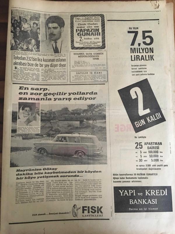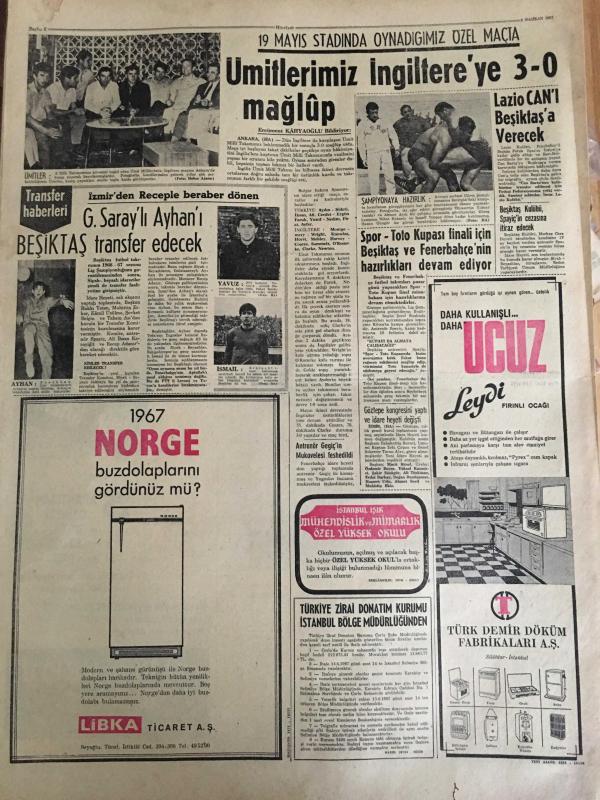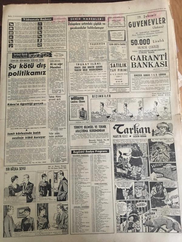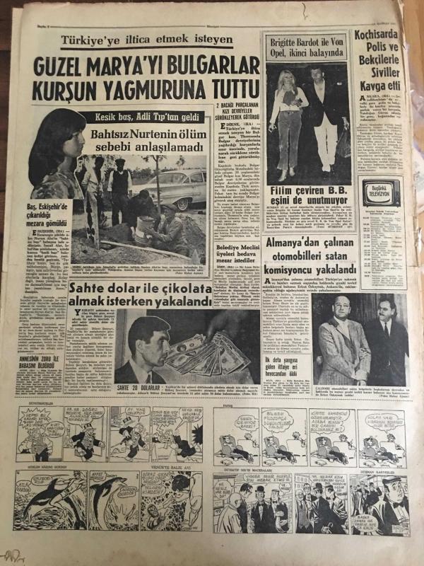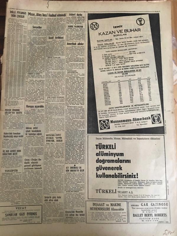 HÜRRİYET GAZETESİ 8 HAZİRAN 1967 YIL :20 SAYI :6867--Mısır Ateş-kes -i kabul etmedi ---Mısır da askeri darbe --İsrail kuvvetleri Süveyş e vardı Kahire banliyösü bombalandı --Sovyetler Orta-Doğu da Bir Çatışmaya Girmek İstemiyor ---Dolapdere sırtındaki çöplük ve gecekonduları kaldırılamıyor ---Amerika nın bütçe açığı 300 milyon dolar olacak ---Toto dan 232 bin lira kazanan ustanın akrabası bize de bir şey düşer --Ümitlerimiz İngiltere ye 3-0 mağlup ---Galatasaraylı Ayhan ı Beşiktaş transfer edecek ---Spor -Toto Kupası finali için Beşiktaş ve Fenerbahçe nin hazırlıkları devam ediyor ---Lazio Can ı Beşiktaş verecek ---Güzel Marya yı Bulgarlar Kurşun Yağmuruna Tuttu ----Sahte dolar ile çikolata almak isterken yakalandı ---Brigitte Bardot ile Von Opel ikinci balayında ---Almanya dan çalınan otomobilleri satan komisyoncu yakalandı ----Koçhisar da polis ve bekçilerle siviller kavga etti ---Orta doğu savaşında ölen gazetecilerin sayısı üçe yükseldi ---- Yıpranma, sararmalar, kupon kesiği ve yırtılmalar zamana bağlı olarak görülebilir.